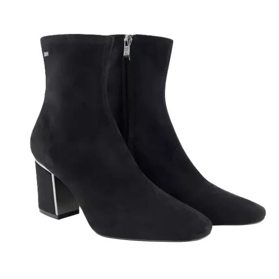 Chic and sculptural with a sleek finish, these high-heeled booties offer a fashion-forward take on timeless design. Crafted in stretchy microsuede with a smooth almond toe, they hug the ankle for a flattering silhouette. The inner ankle zipper ensures an easy slip-on fit, while the comfort insole and flexible outsole support all-day wear. A metallic silver heel detail adds a subtle flash of glamour to this classic profile. Designed with a medium calf width and tailored shaft height, this boot pairs effortlessly with dresses, denim, or wide-leg trousers. Perfect for sleek streetwear, city chic, quiet luxury, and minimal glam aesthetics.