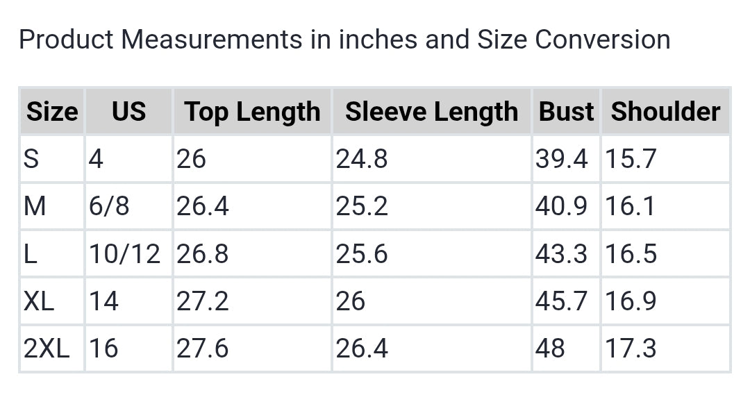 | Size | US | Top Length | Sleeve Length | Bust | Shoulder |