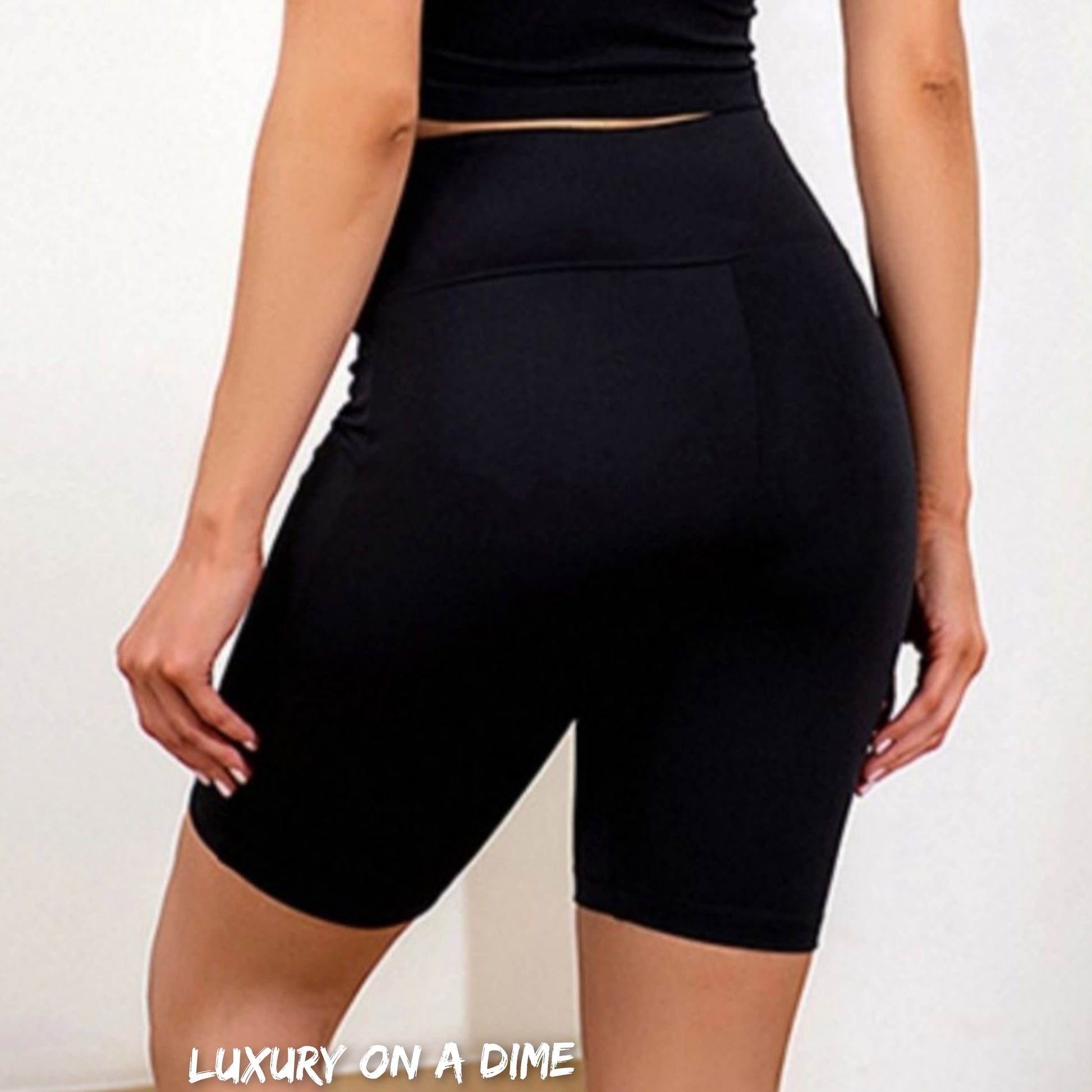 The biker shorts have a wide high-waist elasticized waistband for a flattering fit.