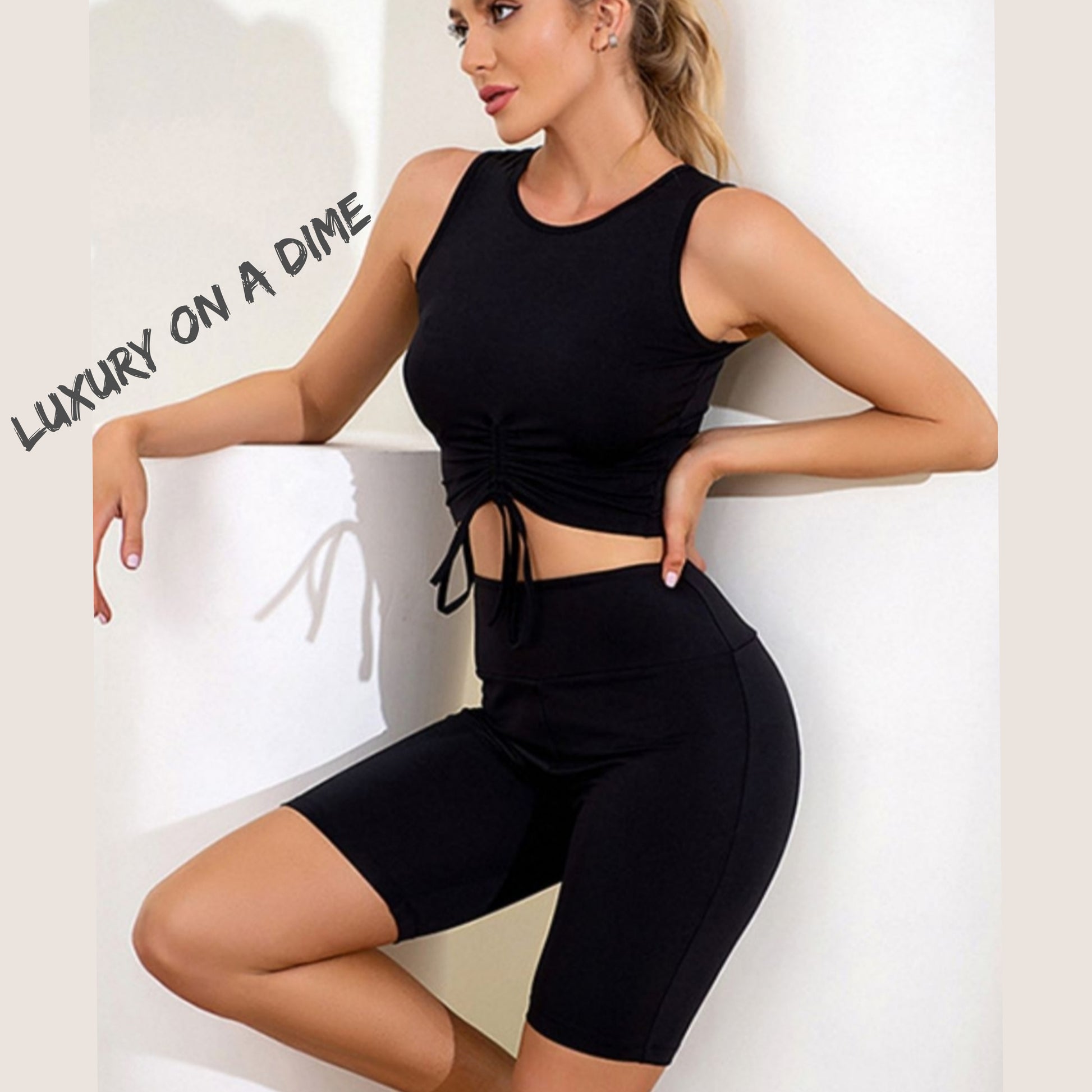 Drawstring Sleeveless Crop Sports Top and Biker Shorts Set