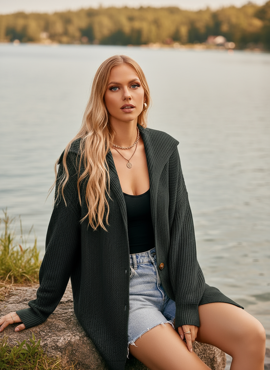 This cape-style cardigan captures the essence of quiet luxury and effortless sophistication with its relaxed silhouette and refined structure. The dropped shoulder design and oversized fold-over collar add a touch of modern minimalism, blending cozy comfort with timeless elegance. Made from soft knit with a slightly stretchy feel, it drapes gracefully for a flattering, laid-back fit. The button-front closure and ribbed hems lend a classic touch, while the cozy texture evokes autumnal serenity and old money ease. Perfect for layering over casual denim or pairing with tailored basics, this cardigan reflects a blend of soft classic and capsule wardrobe aesthetics, ideal for those drawn to understated chic and elevated simplicity.