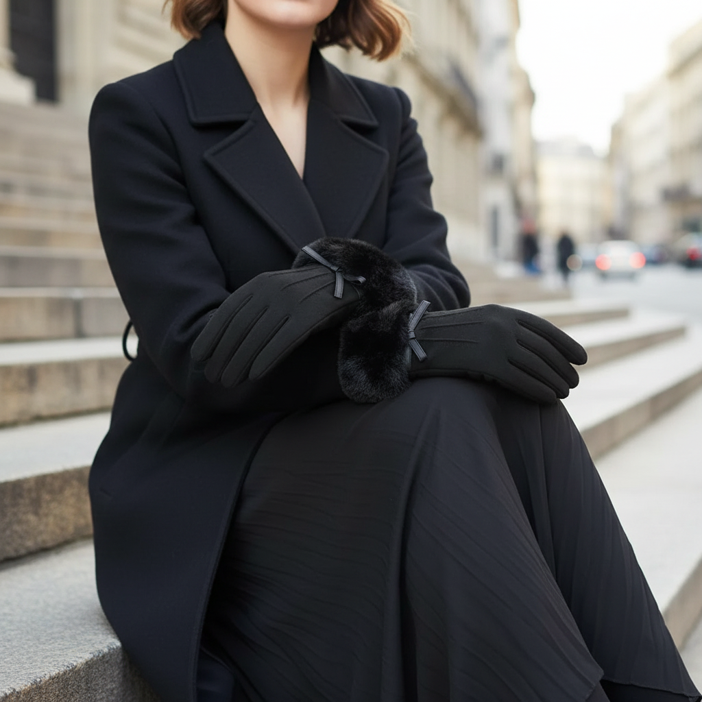 compatible fingertip, they allow you to stay connected without removing your gloves. The vegan suede exterior offers a polished matte texture, balancing cozy hygge comfort with modern minimalism. These gloves fit seamlessly into soft winter aesthetics, quiet luxury inspired outfits, and elevated daily wear. Lightweight yet warm, they deliver both visual softness and functional insulation, making them an essential cold season accessory.