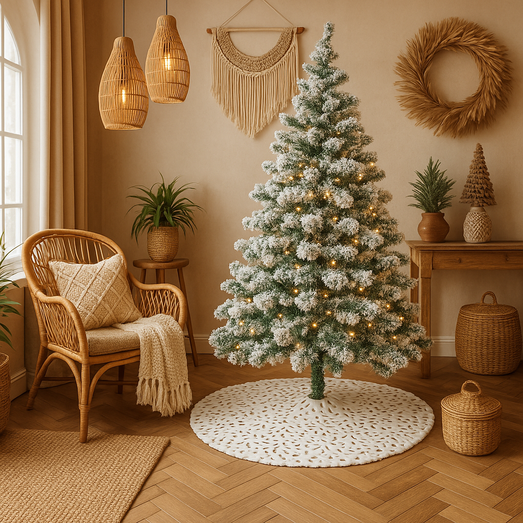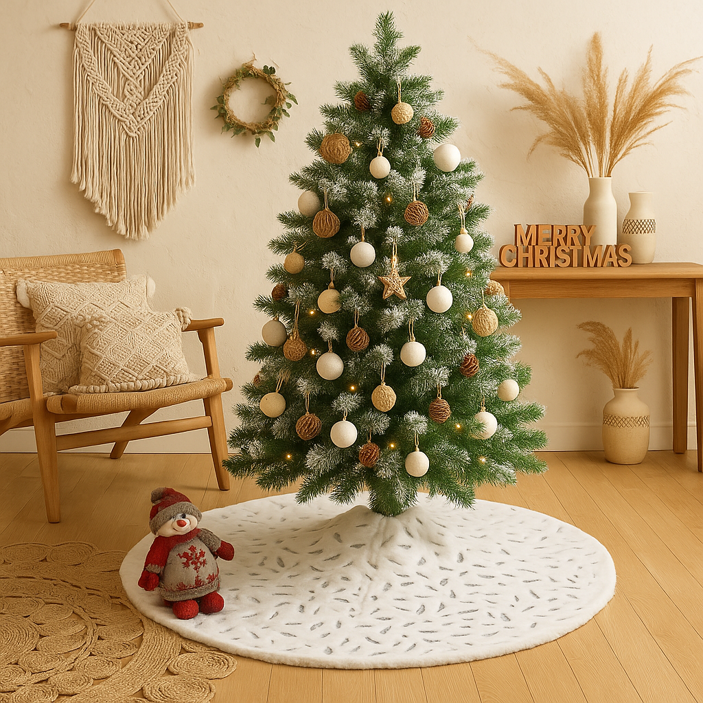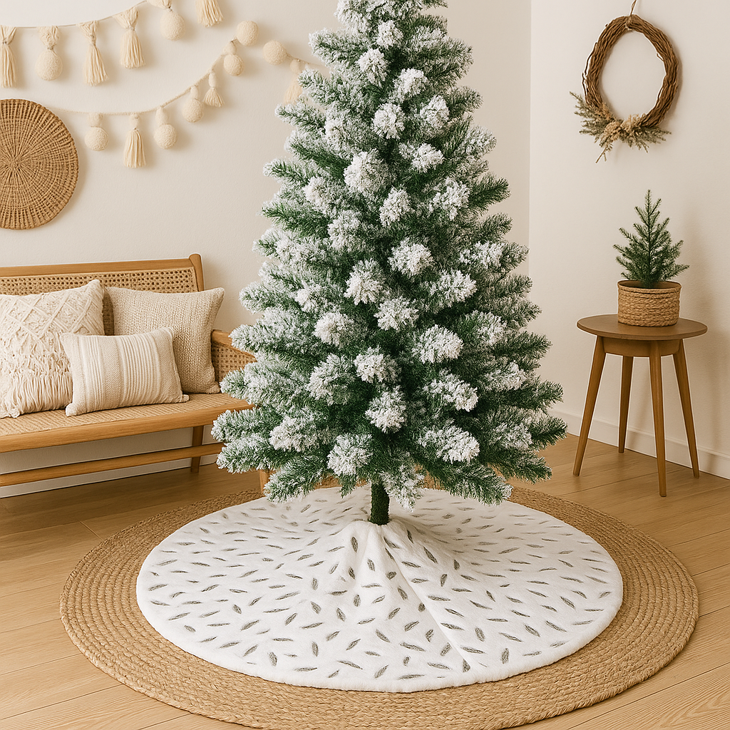 Bring a touch of boho elegance to your holiday décor with this stunning feather print Christmas tree skirt. Measuring 47.4 inches in diameter, it’s designed to beautifully frame your tree while hiding stands or bases for a polished look. The crisp white background is adorned with shimmering metallic feather accents, catching the light and adding a festive sparkle to your holiday setting. Crafted from soft, durable fabric, this tree skirt drapes gracefully and provides a luxe foundation for your presents. Perfect for modern, glam, or classic Christmas aesthetics, it adds warmth and sophistication to any seasonal home or office display.