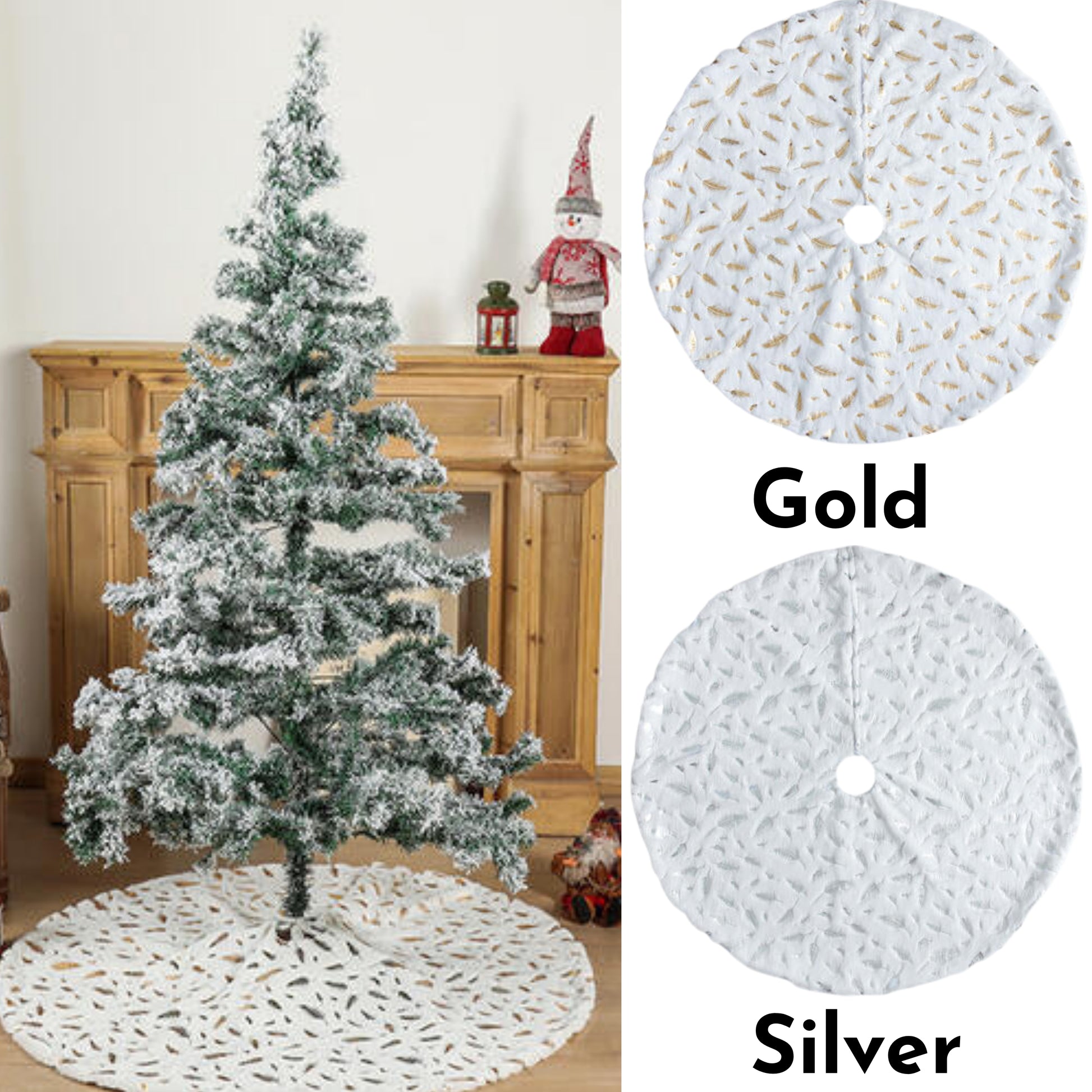 Feather Print Christmas Tree Skirt White Metallic Gold or Silver 47.4"