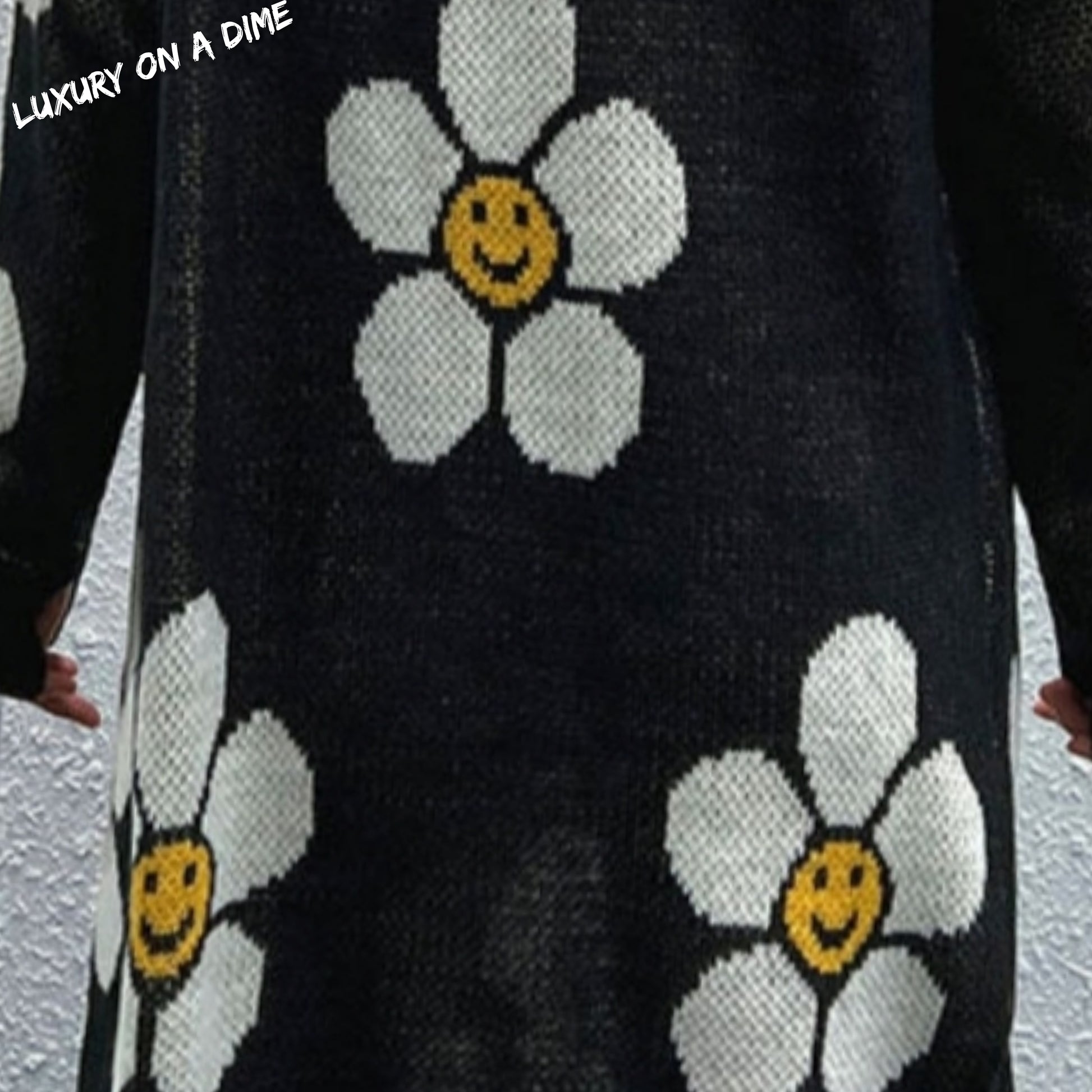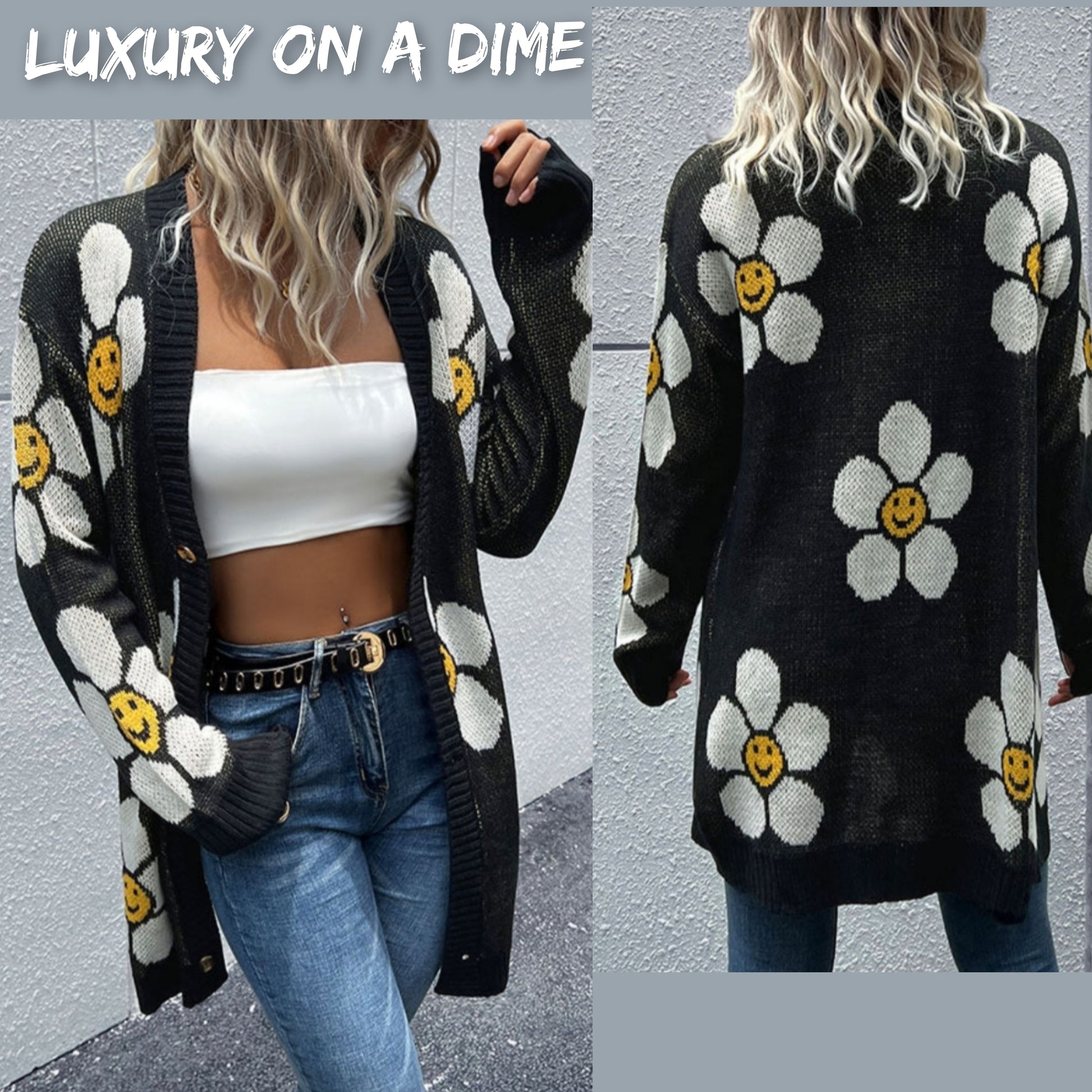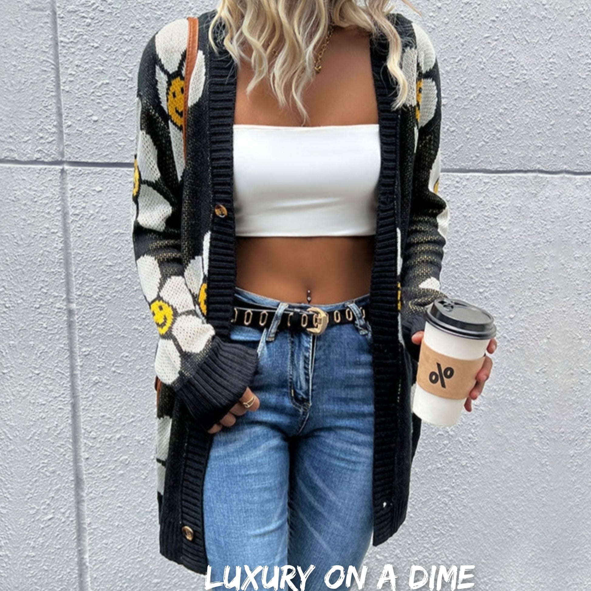 Daisy Smiley Face Button Down Longline Knit Cardigan