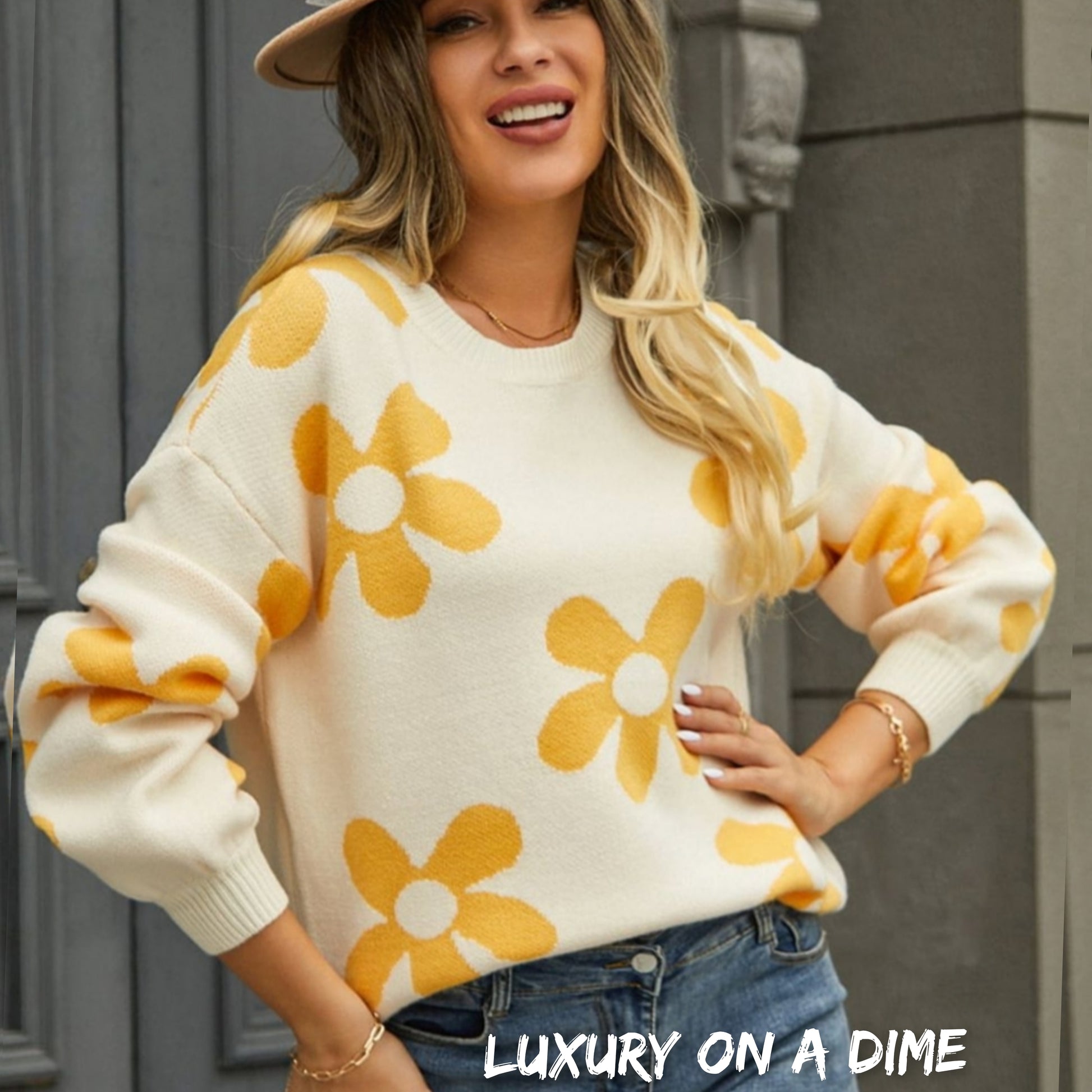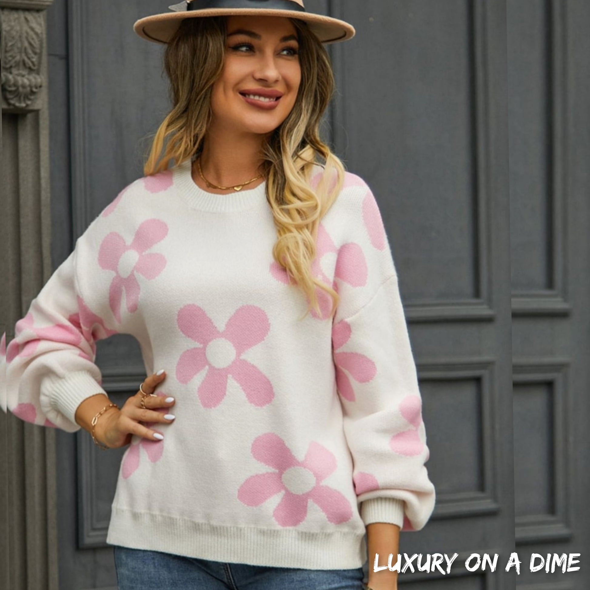 Flower Power Retro Floral Knit Round Neck Long Sleeve Oversized Pullover Sweater