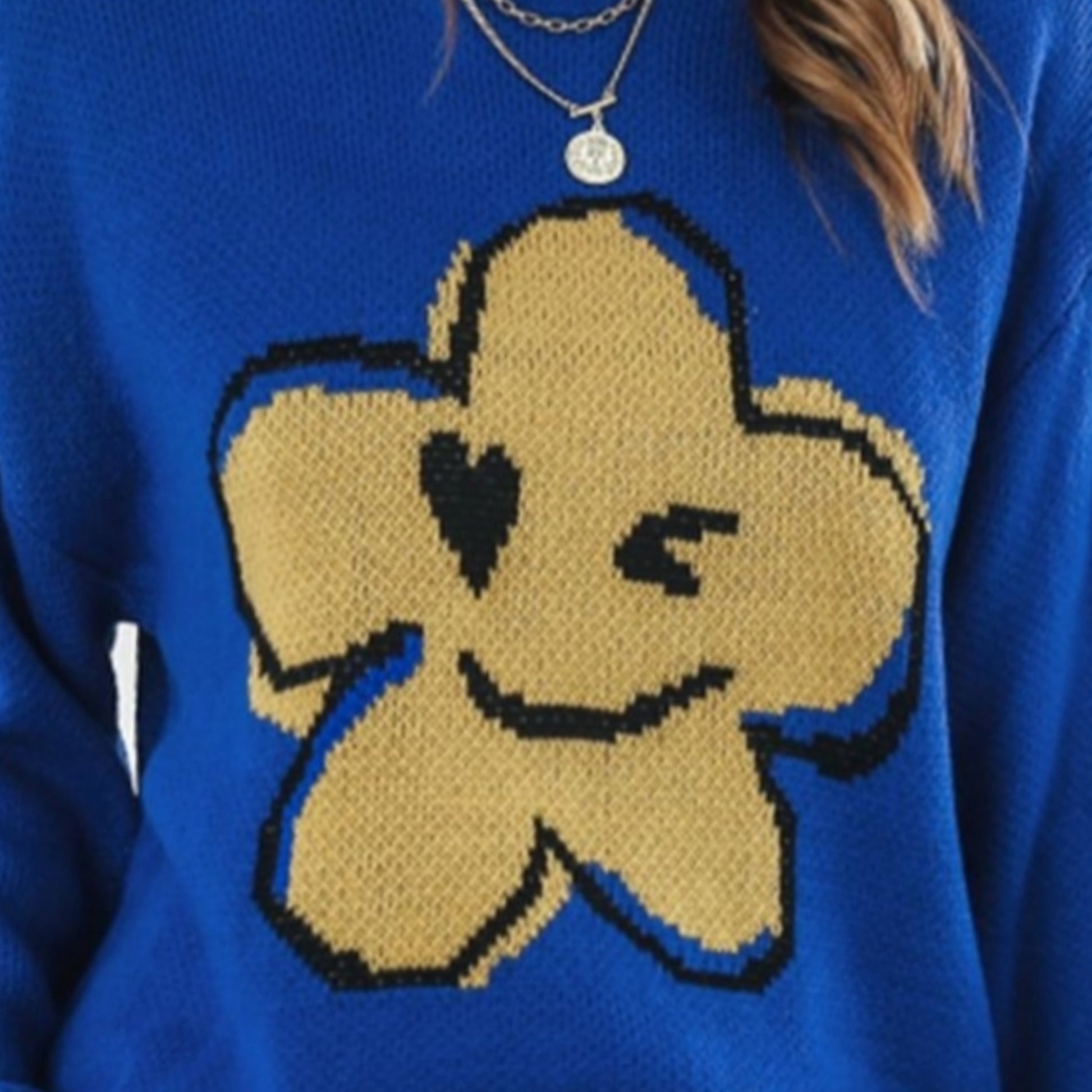 Smiley Face Abstract Flower Bold Color Knit Pullover Long Sleeve Sweater Shirt