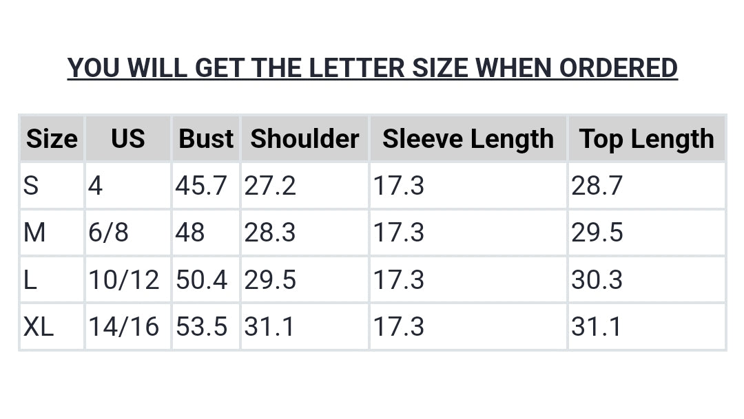 | Size | US | Bust | Shoulder | Sleeve Length | Top Length |