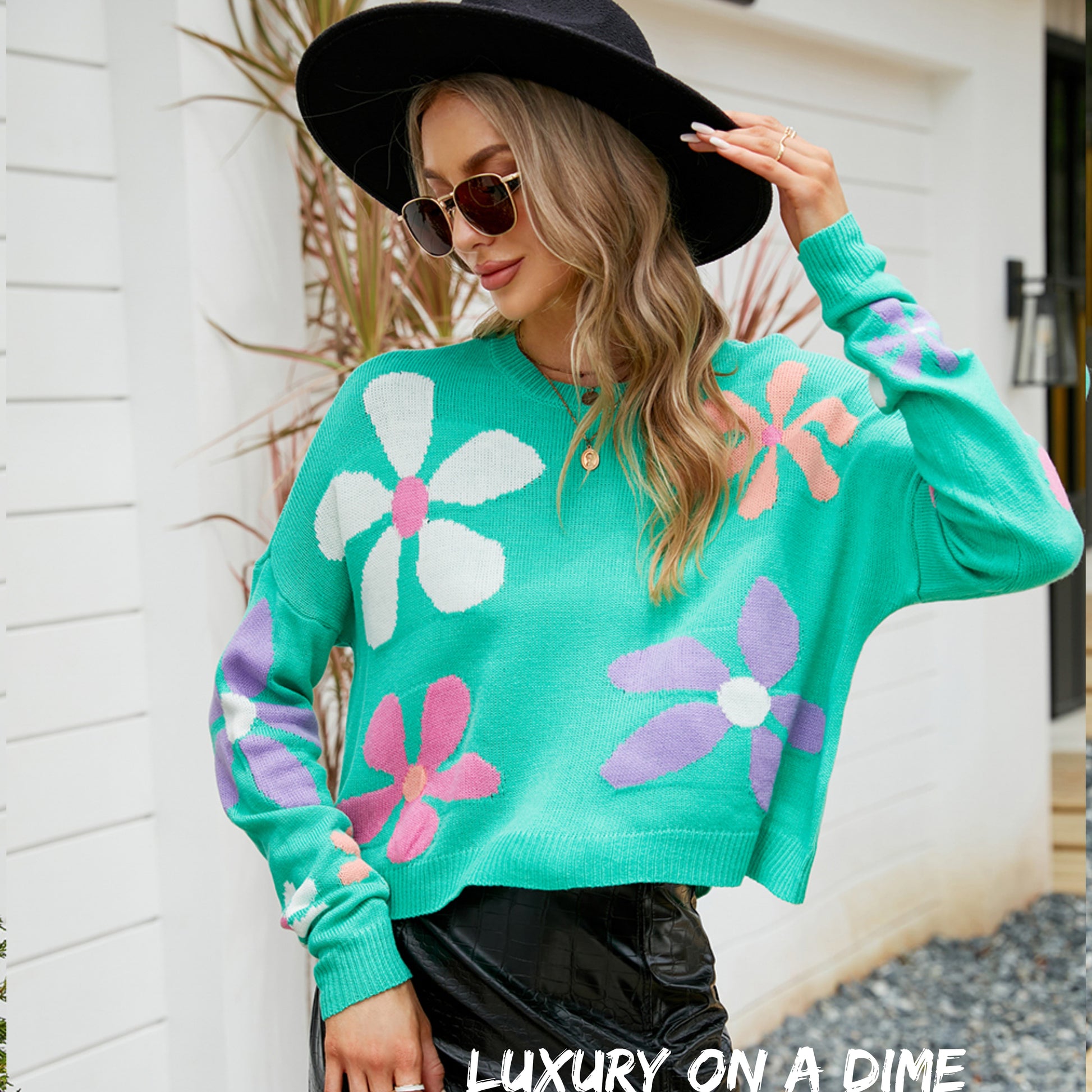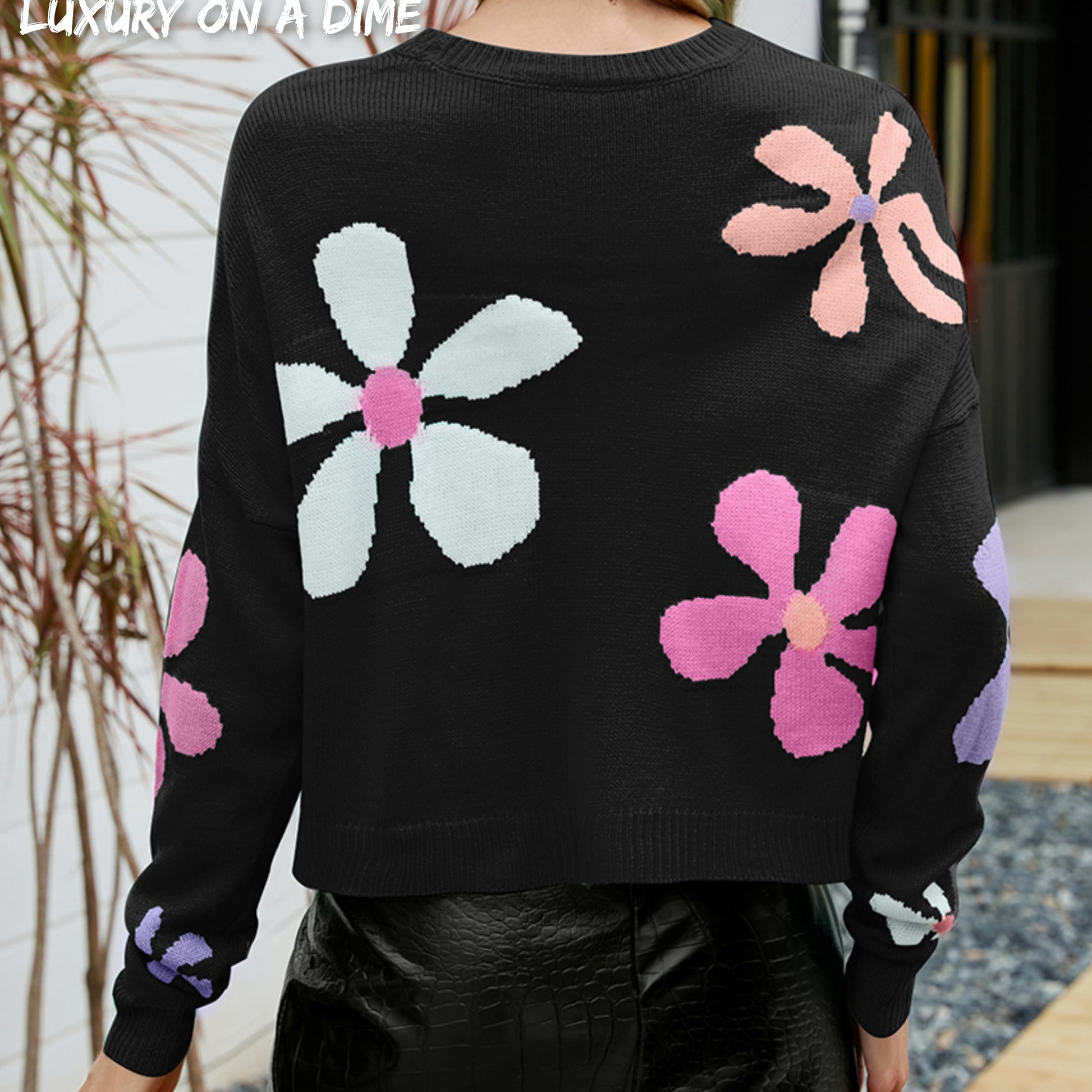 Colorful Knit Daisy Retro Flower Crop Top Long Sleeve Round Neck Sweater Shirt