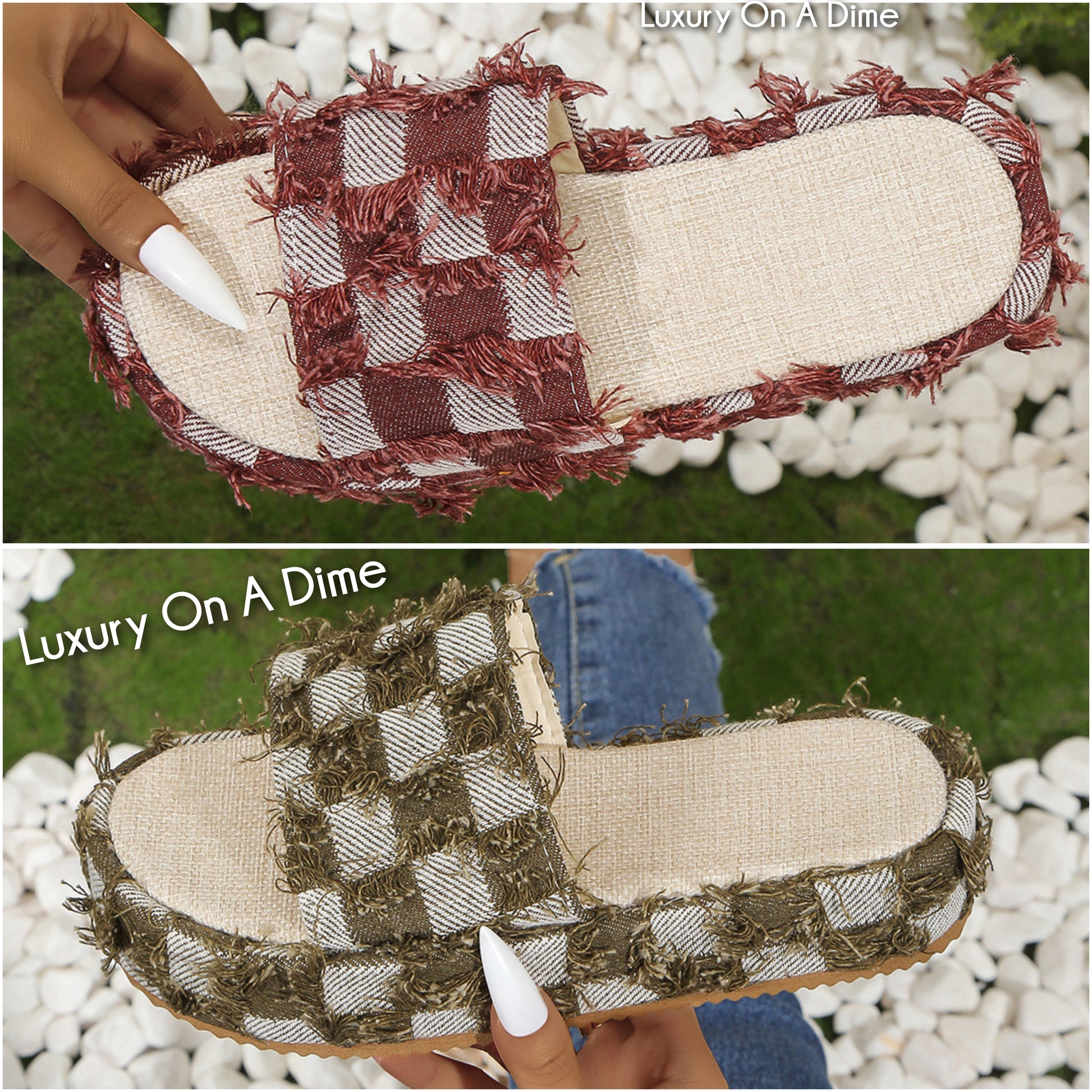 Frayed Denim Platform Sandals Distressed Checker Fringe Slip-on Boho Open-toe Grunge