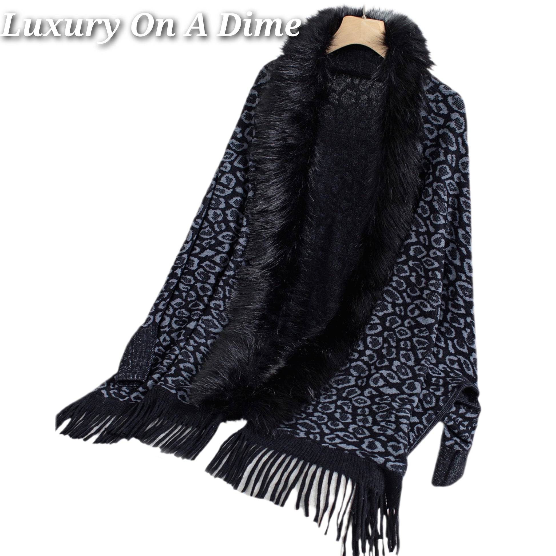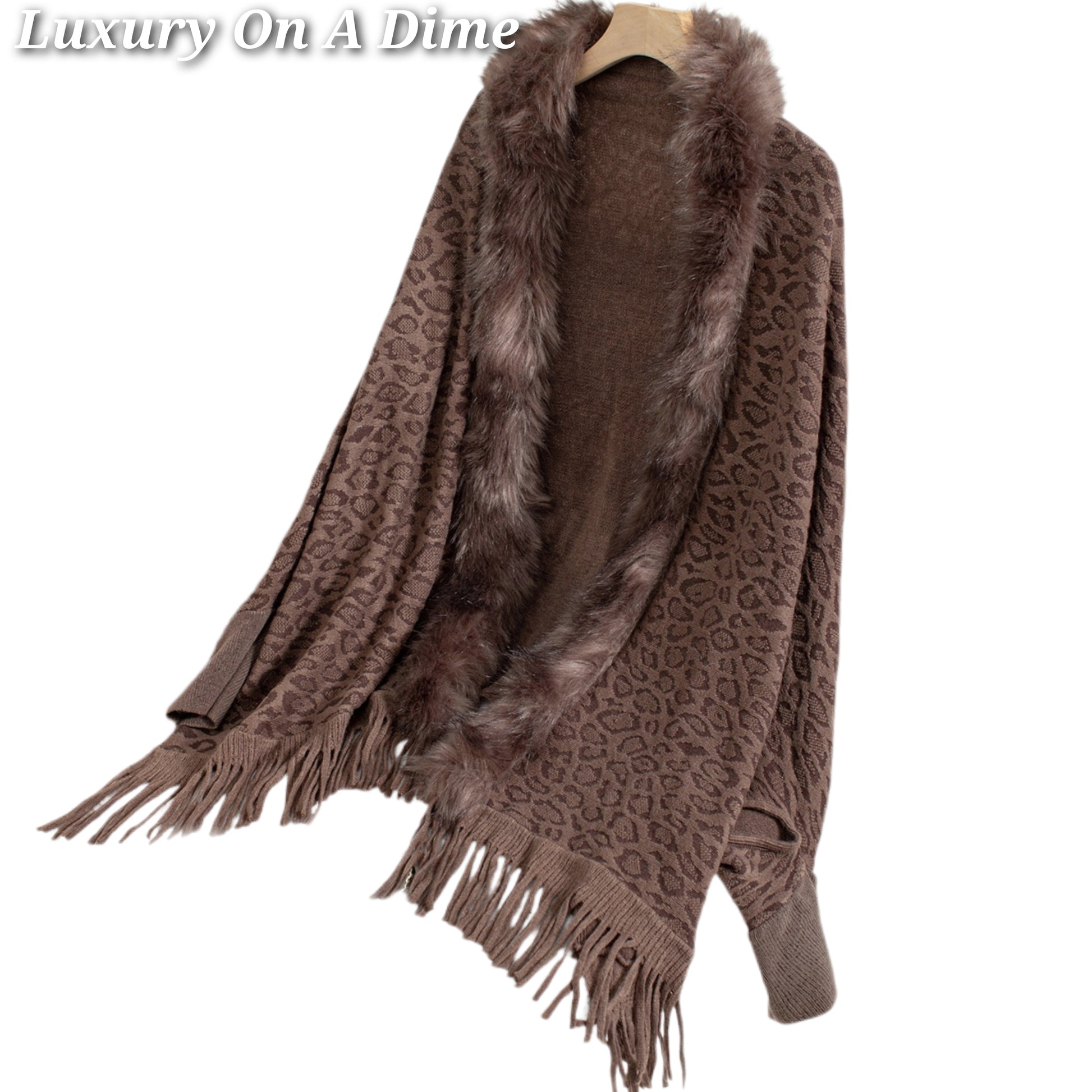 Plush Faux Fur Leopard Retro Fringe Oversized Poncho Knit Cardigan Jacket