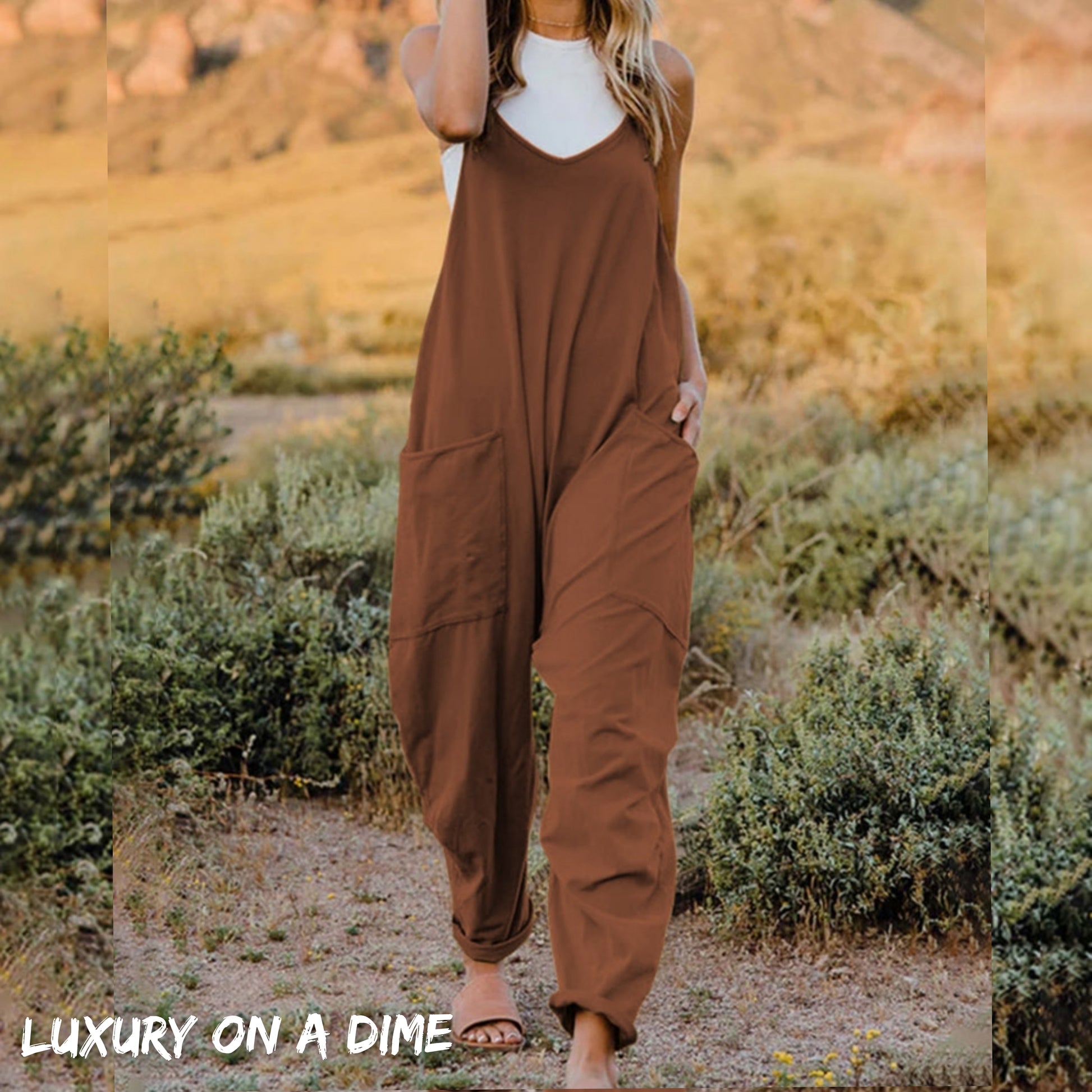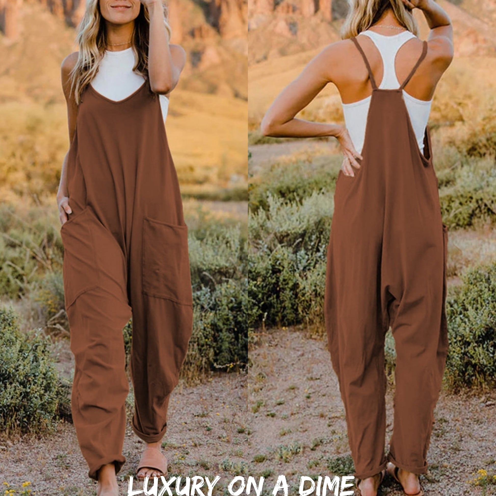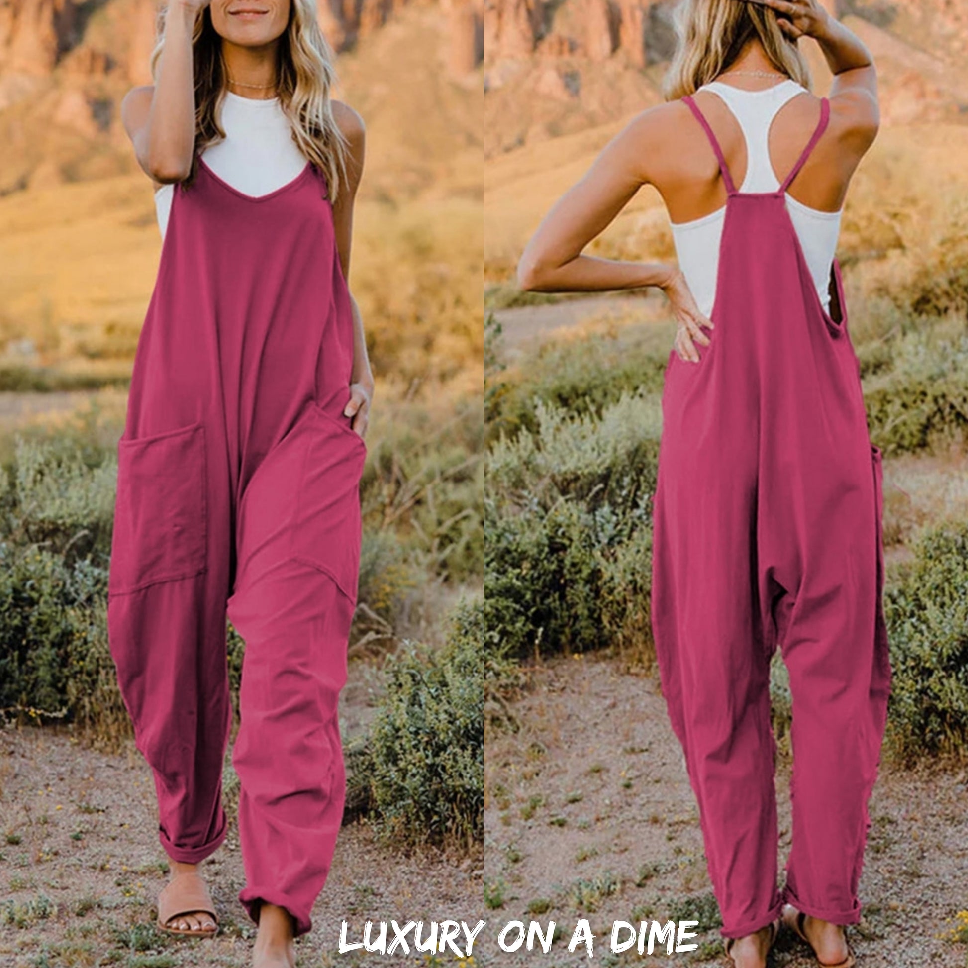 Oversized Hippie V-Neck Sleeveless Wide Leg Pant Pocket Jumpsuit Bohemian Outfit