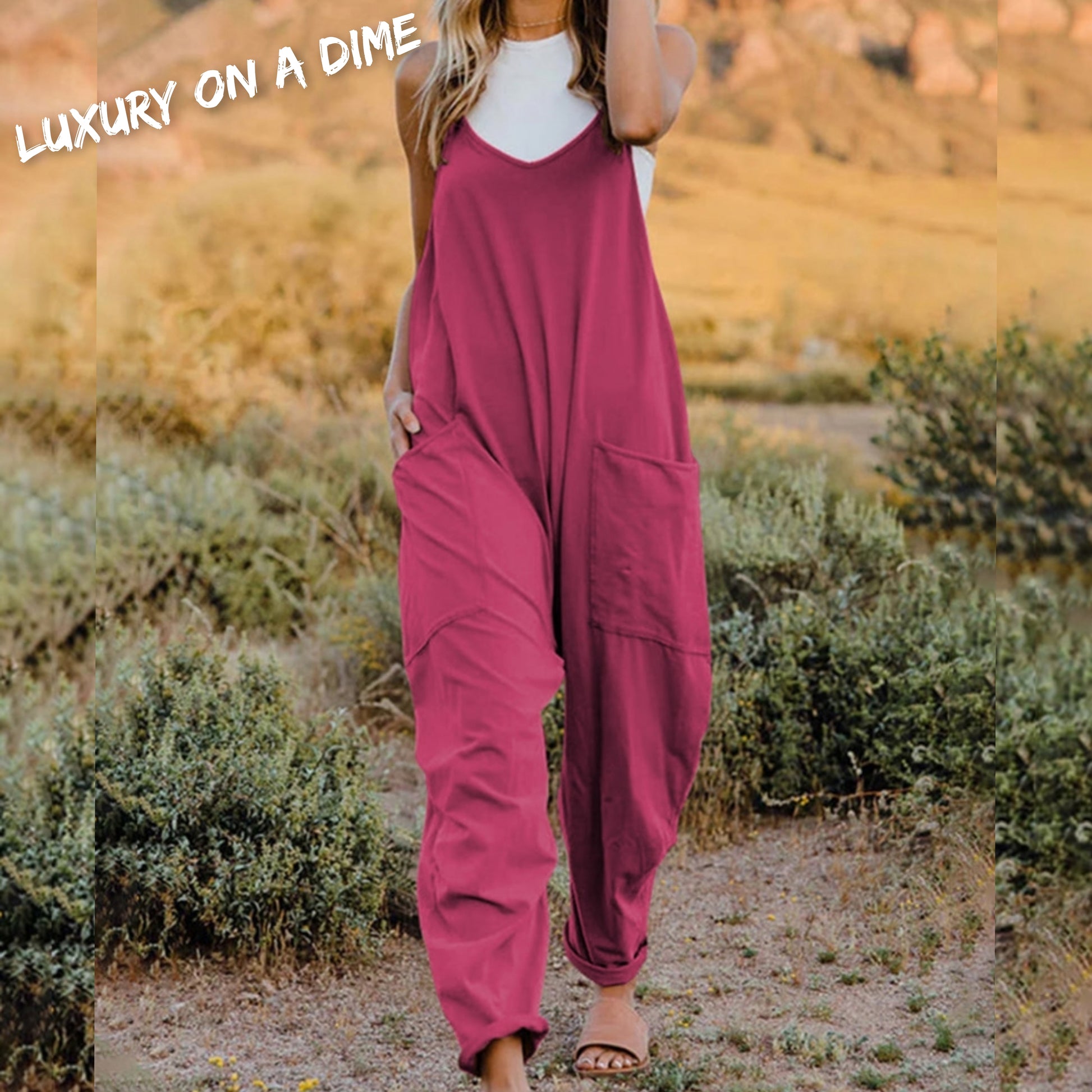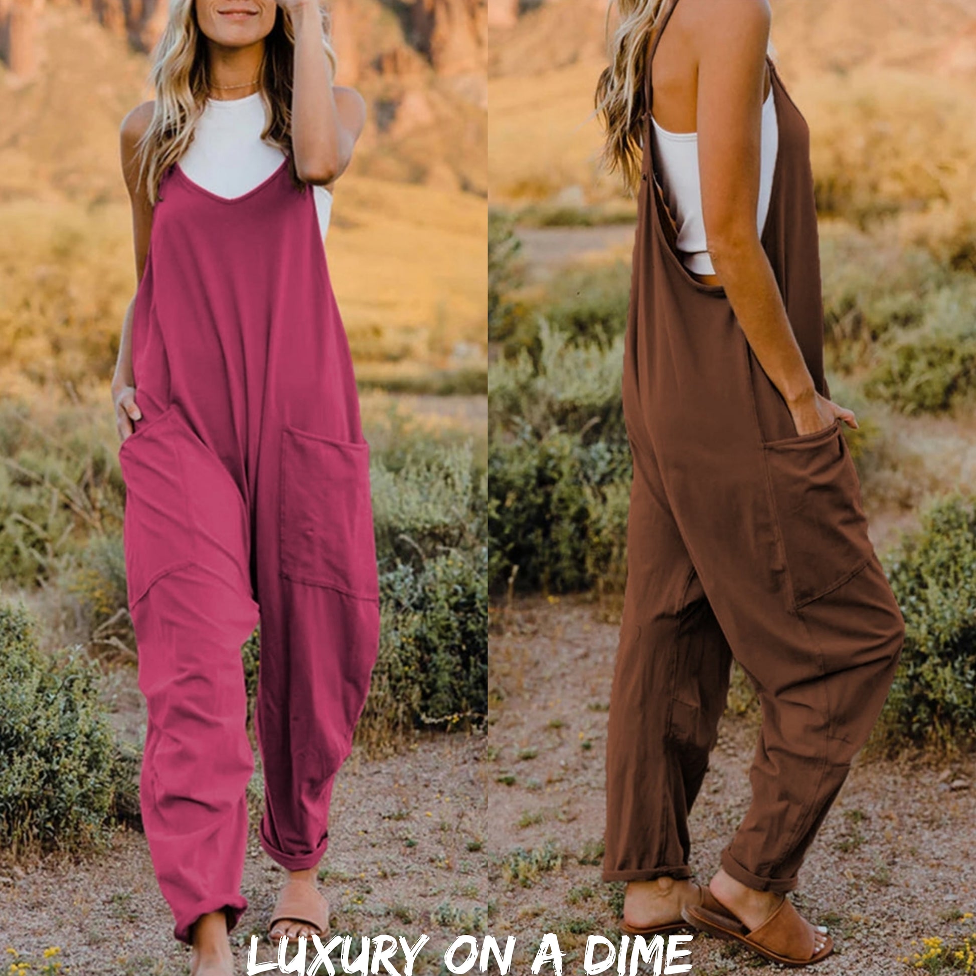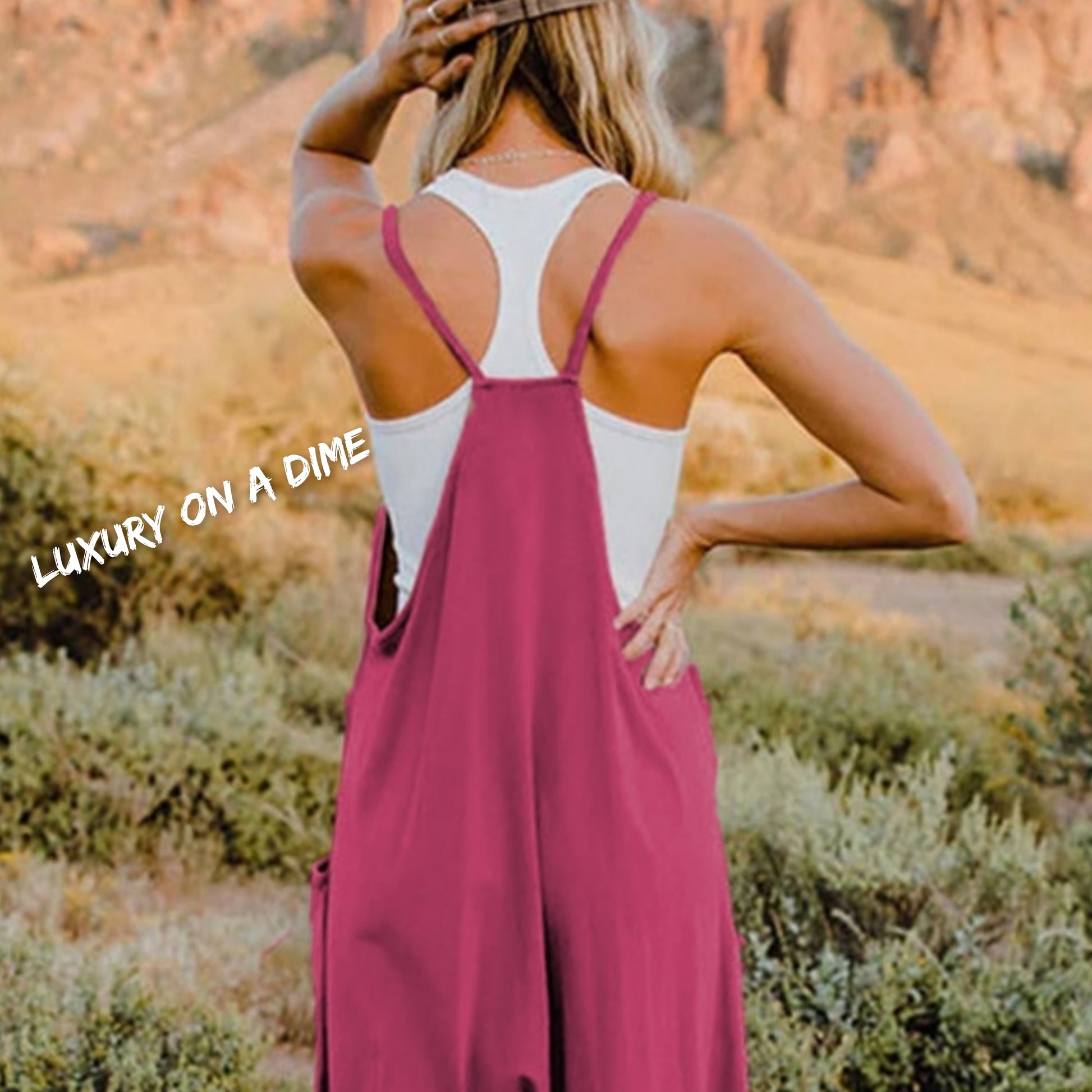 Oversized Hippie V-Neck Sleeveless Wide Leg Pant Pocket Jumpsuit Bohemian Outfit