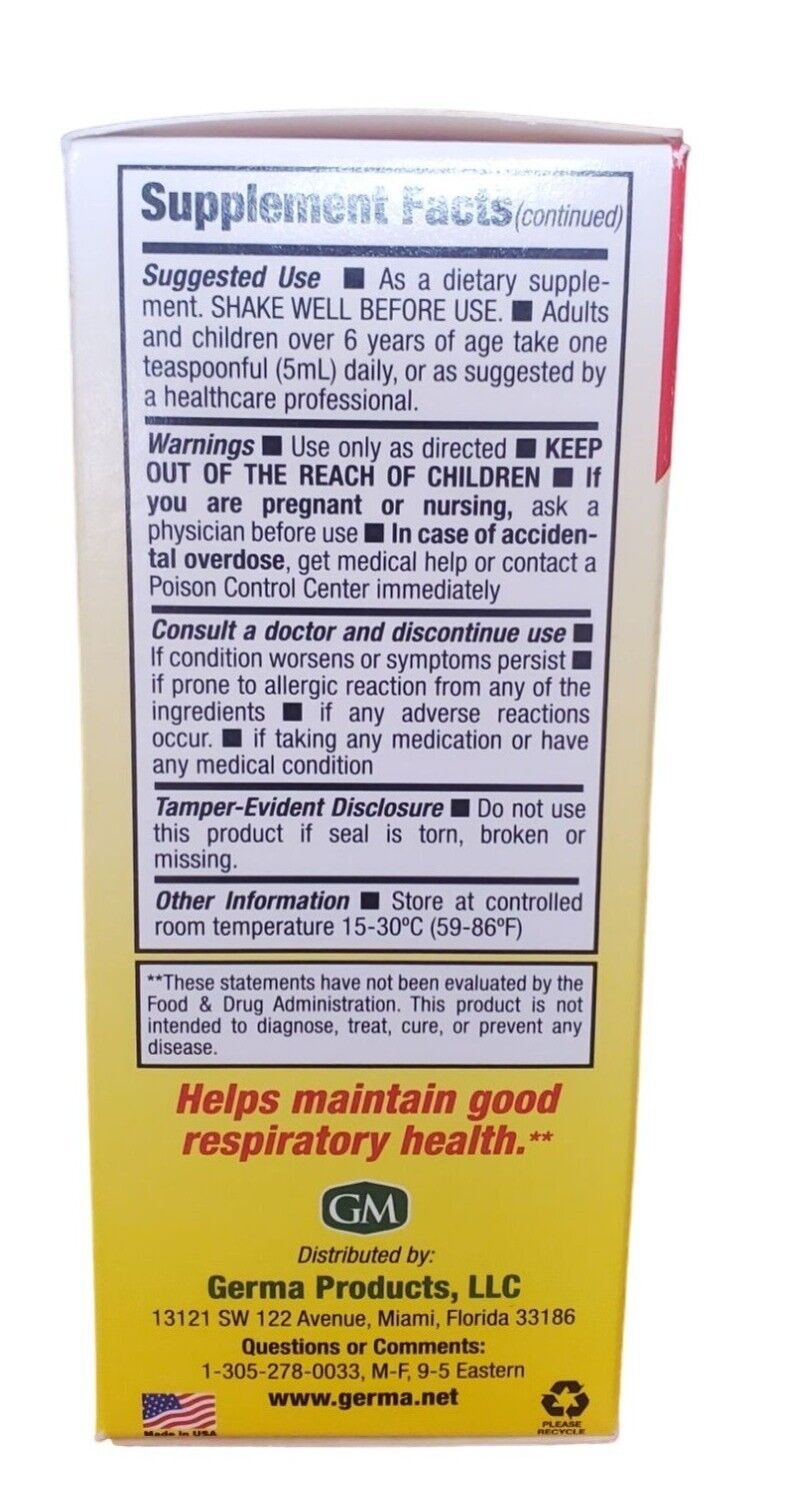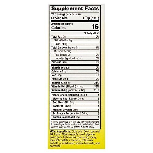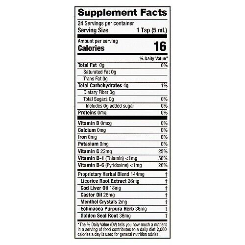 Fortified with Vitamins C, B1, and B6, this dietary supplement may help support respiratory health with its unique combination of ingredients. It features a proprietary herbal blend that includes licorice root extract, cod liver oil, castor oil, menthol crystals, Echinacea purpurea herb, and golden seal root. This special formulation aims to enhance respiratory function and overall well-being.