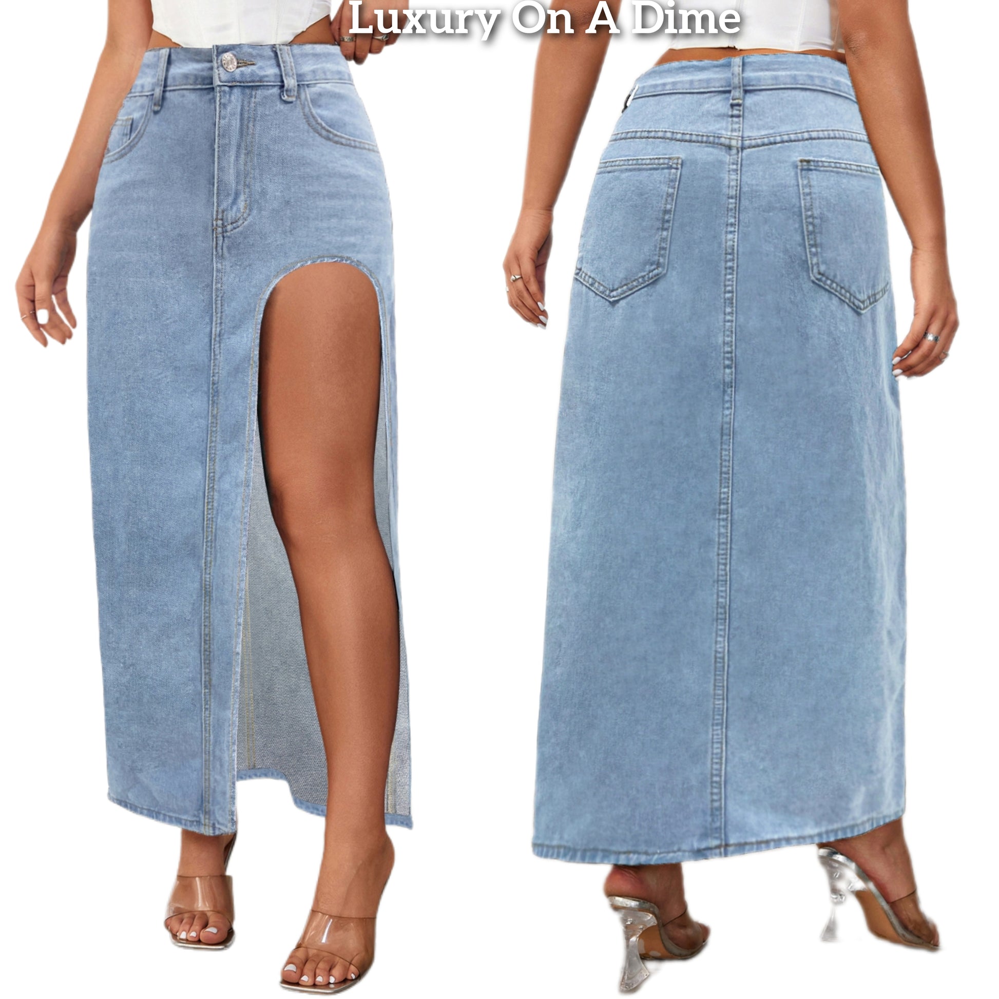 Cutout Denim Maxi High-Rise Waist Straight Long Full Length Pencil Jean Skirt