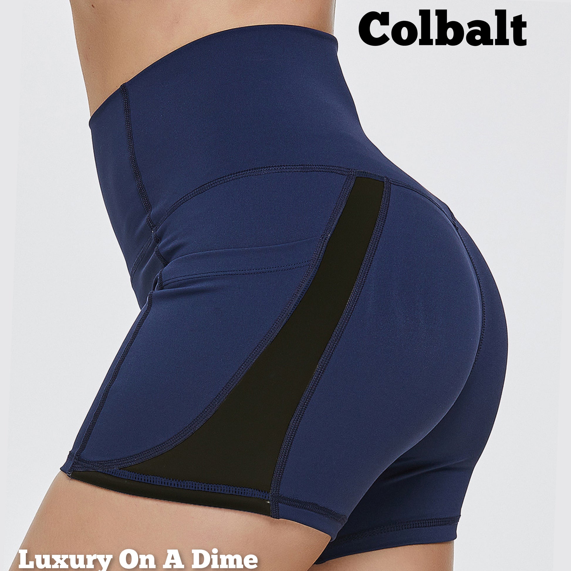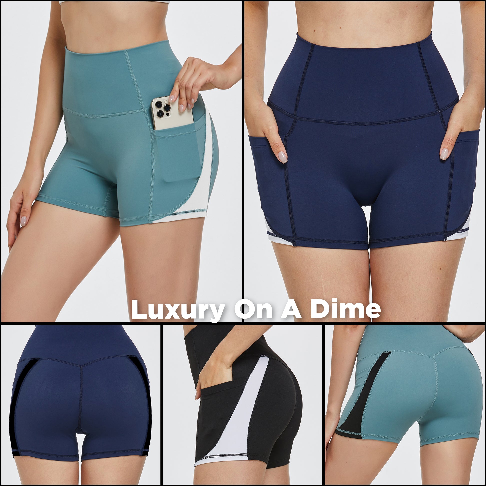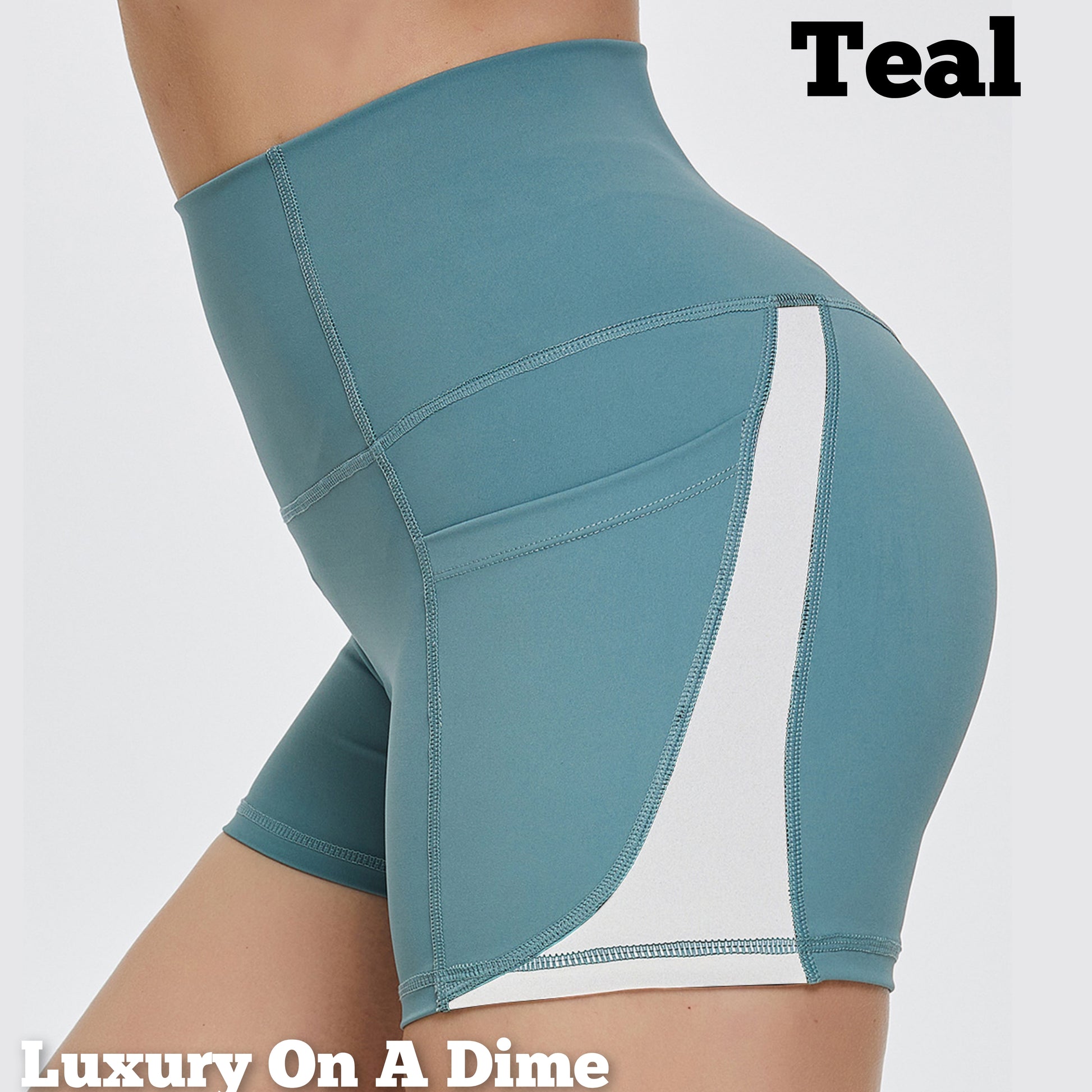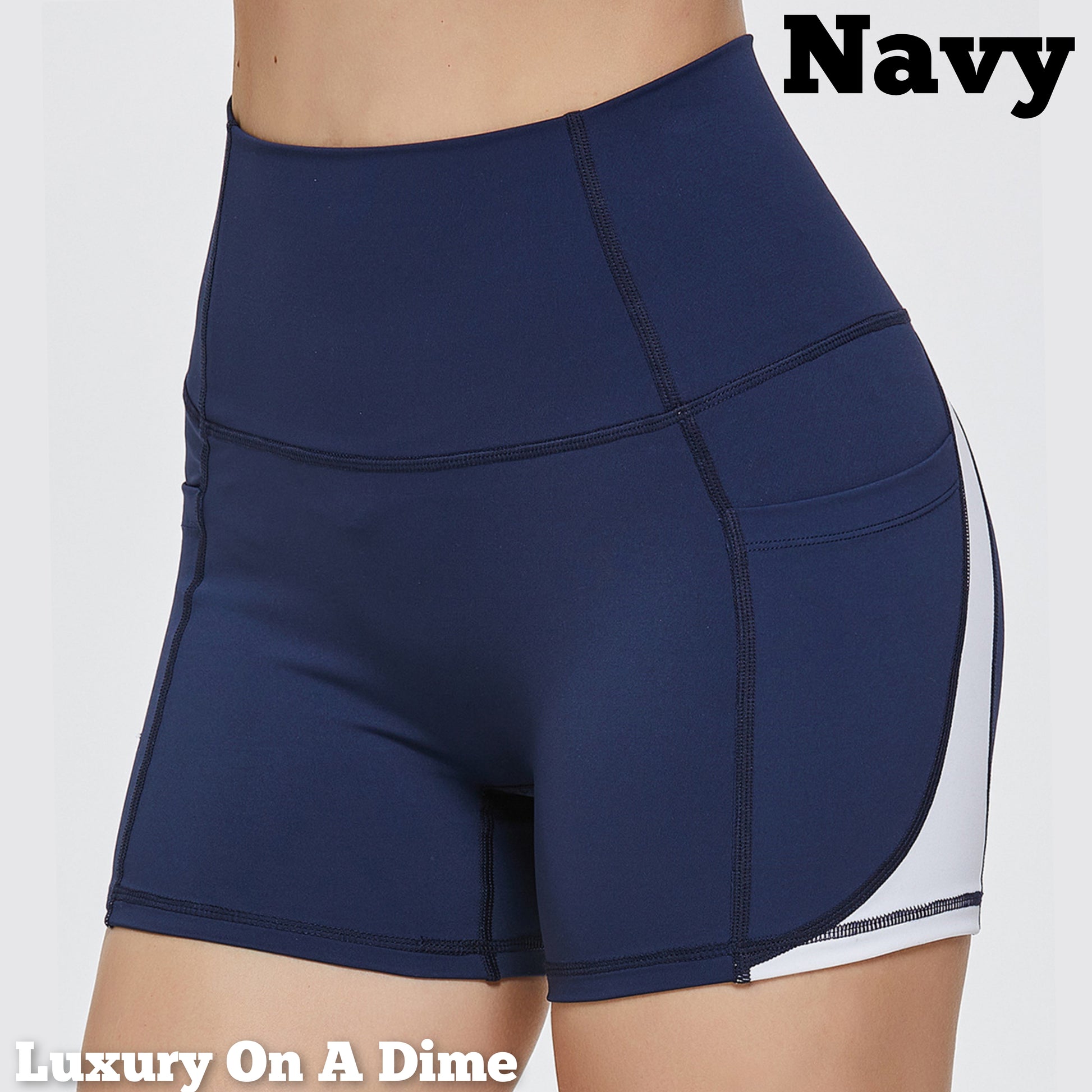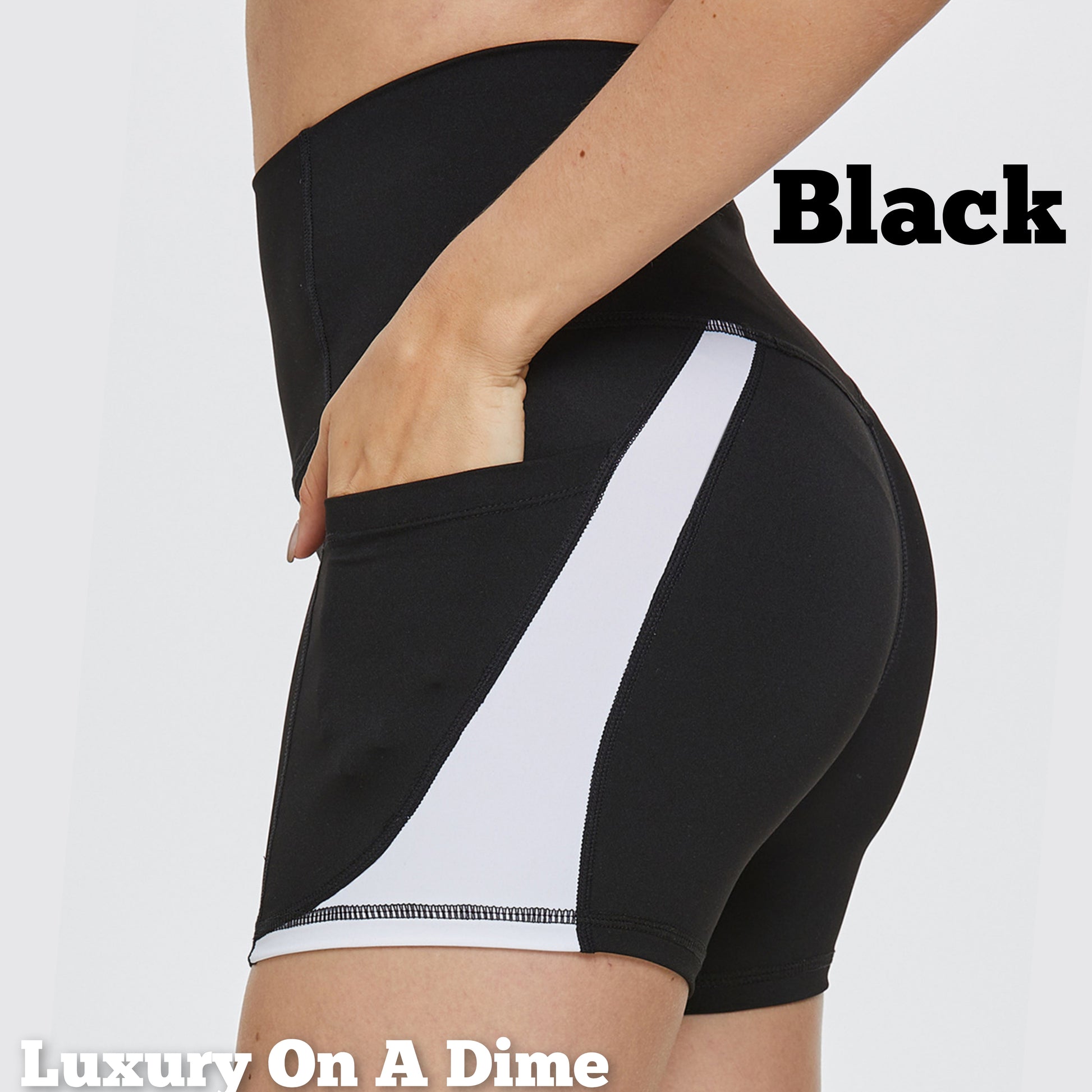 High Rise Waist Pocket Athletic Shorts Wide Waistband Contrasting Stripe Activewear