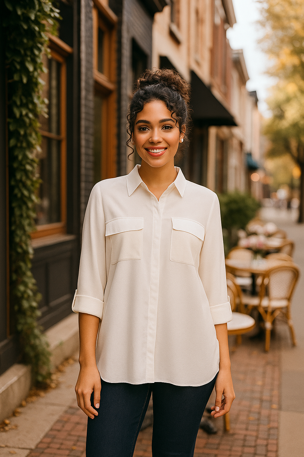 A relaxed boyfriend-fit blouse ensures all-day comfort, while the button-front closure, dual chest pocket, and roll-tab button cuffs add classic detailing.