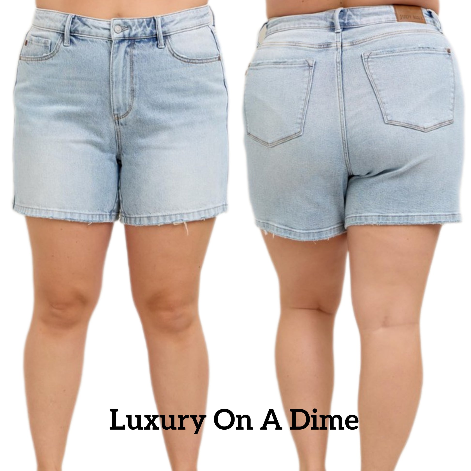 Judy Blue High Rise Denim Relaxed Boyfriend Mid-Length Raw Hem Jean Shorts