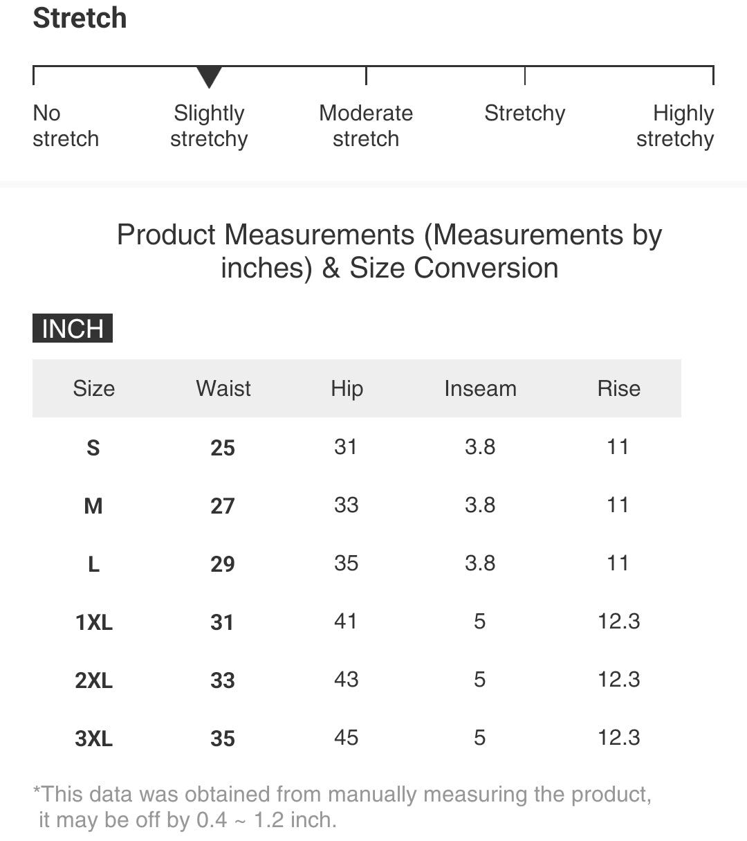 | Size | Waist | Hip | Inseam | Rise |