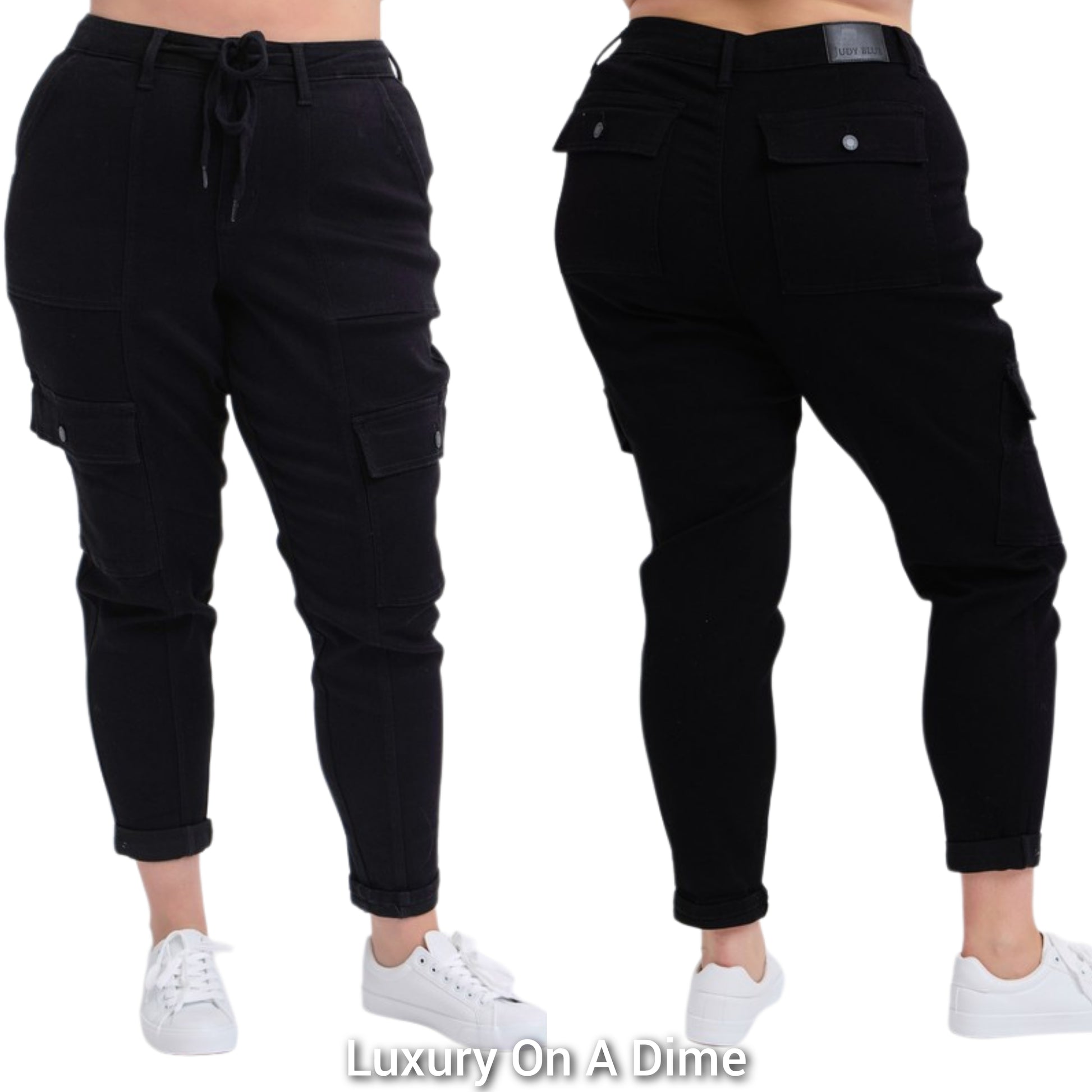 Judy Blue Jogger Cargo Pants High-Rise Drawstring Waist Cuff Ankle Denim Jeans