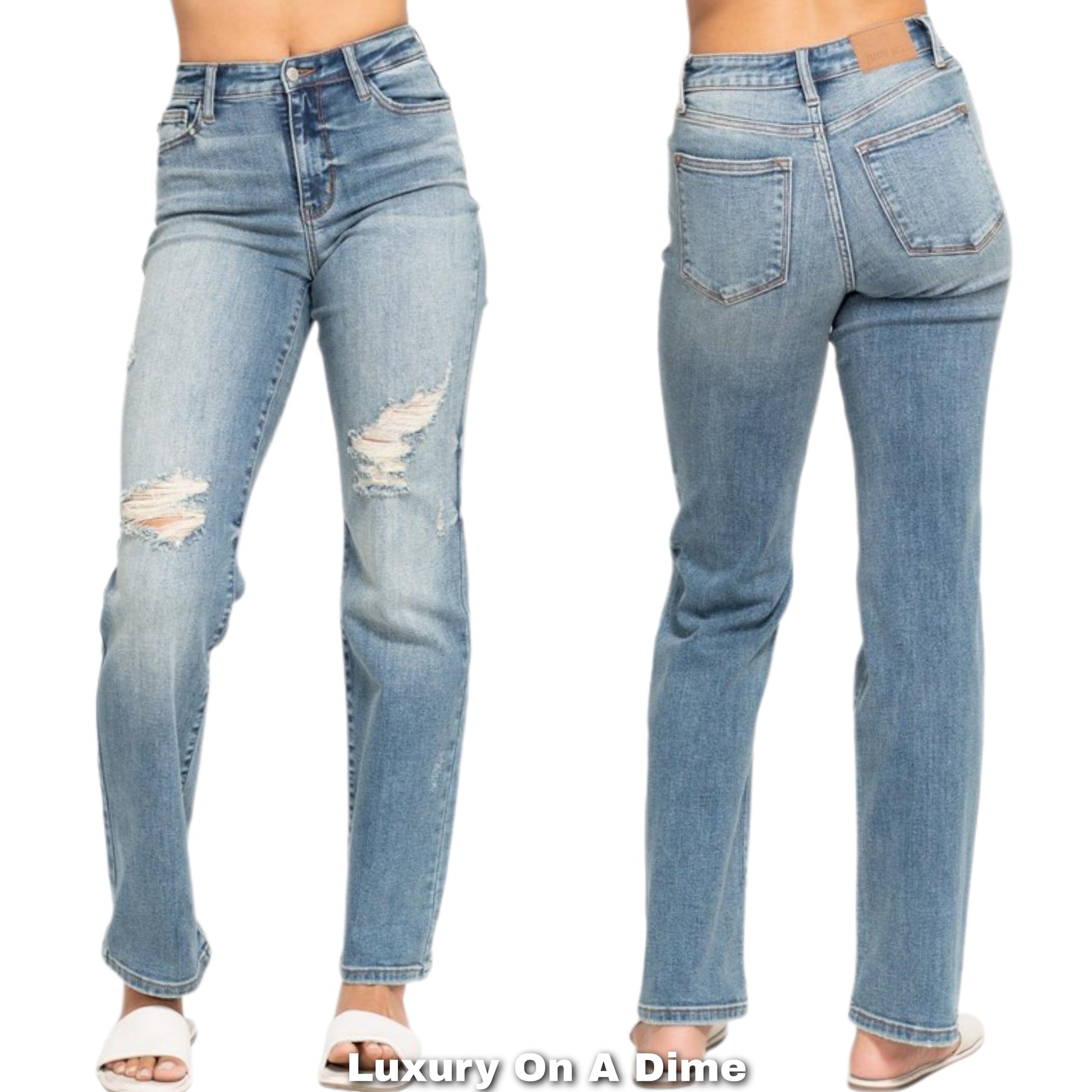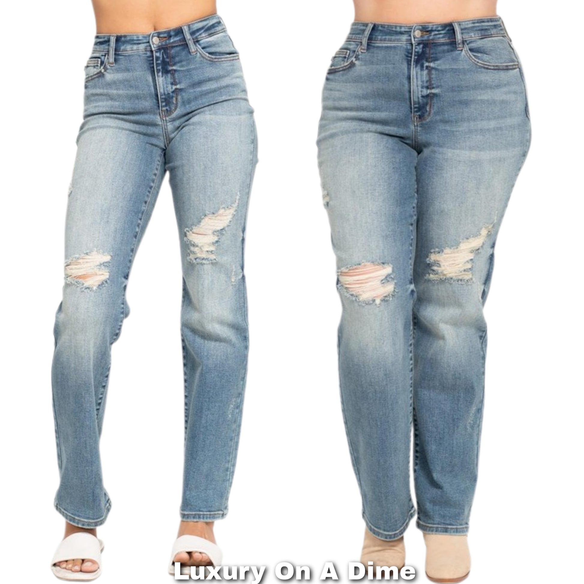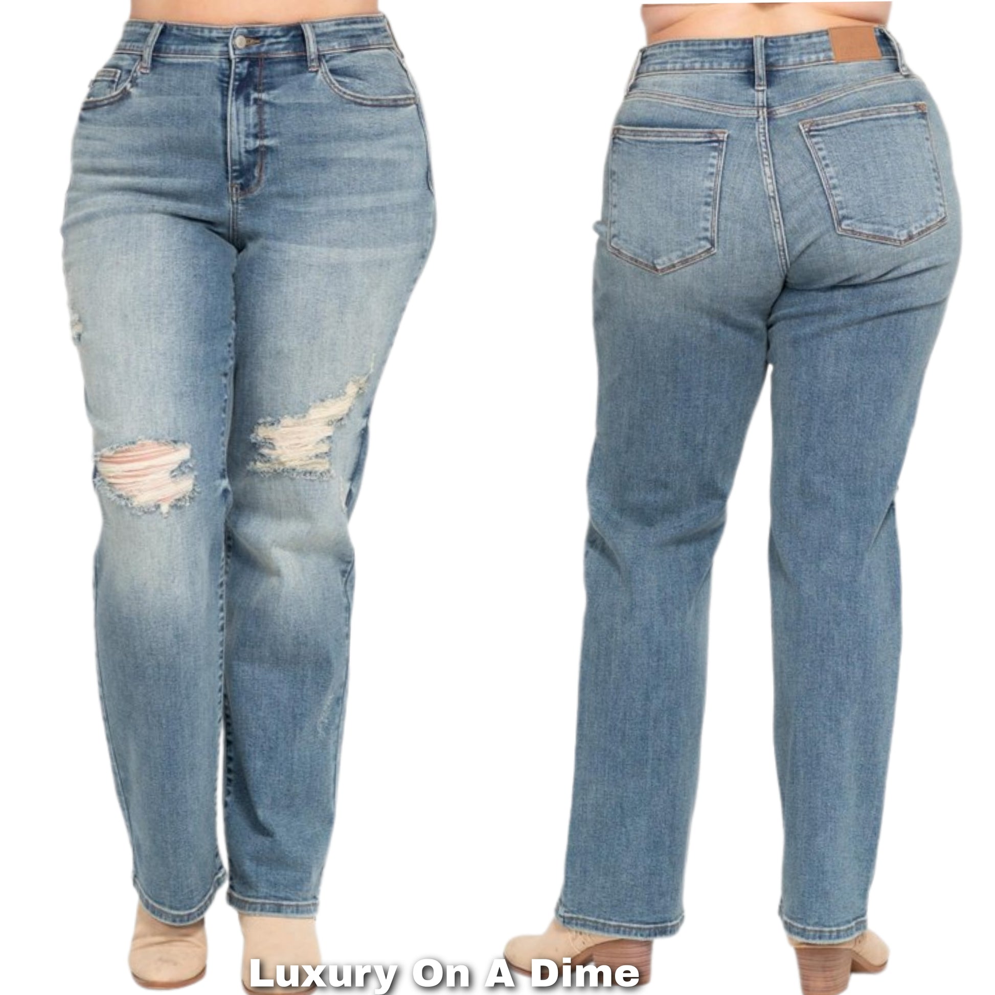 Judy Blue High-Rise Dad Jeans Straight Leg Distressed Boyfriend Denim Pants Plus Size Available
