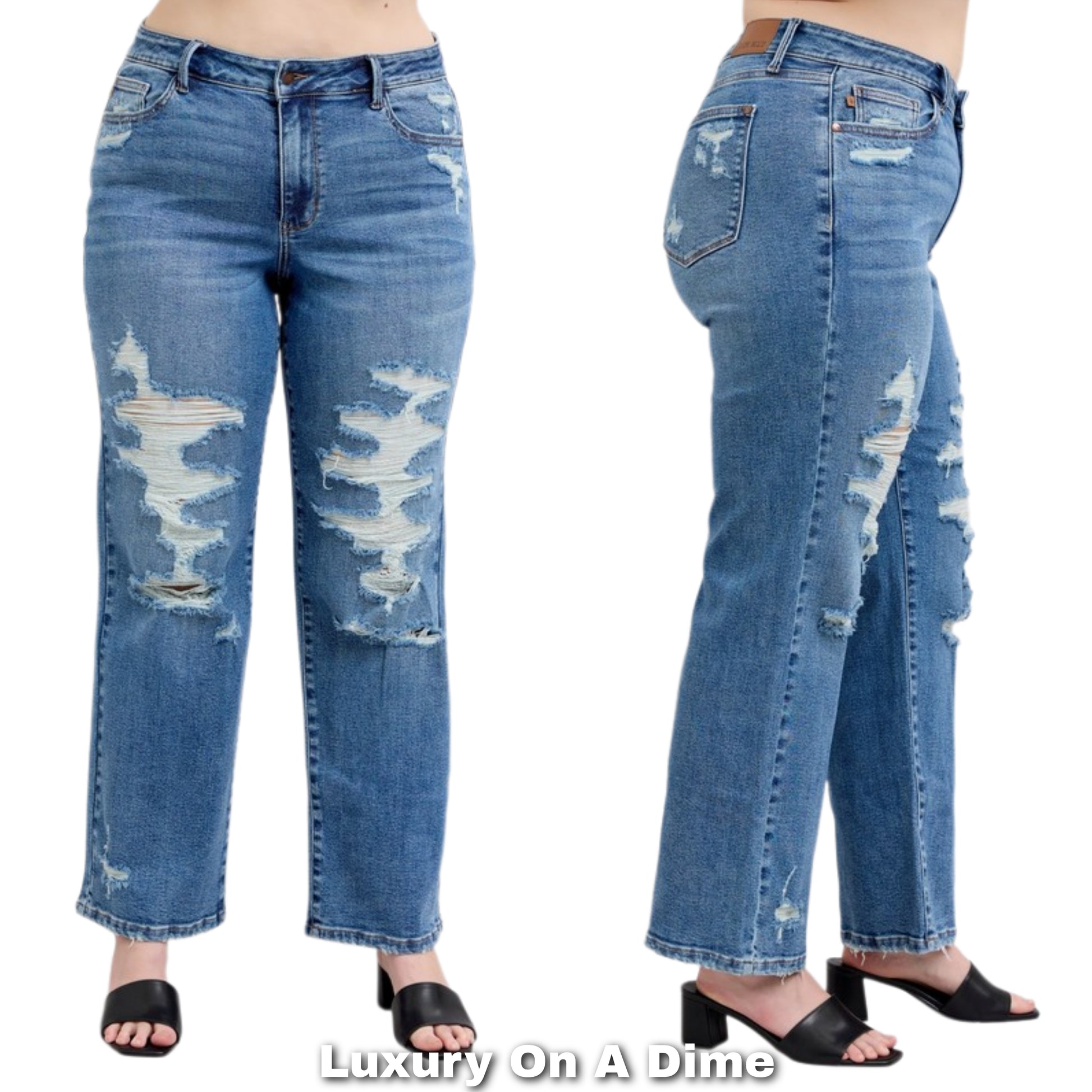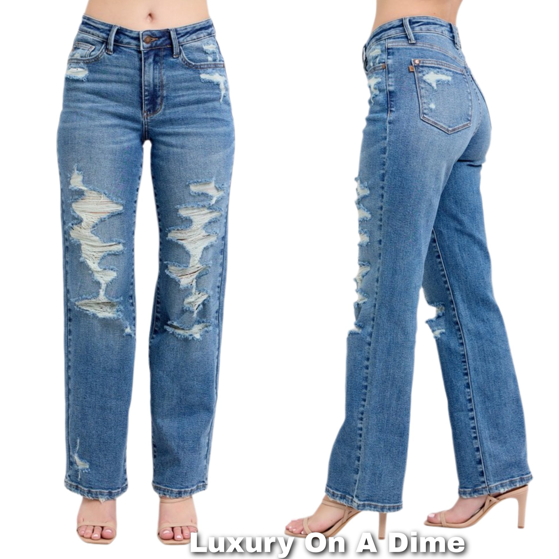 Judy Blue High-Rise Distressed Straight Leg Torn Holes Slim Fit Jeans Denim Pants Plus Size Available