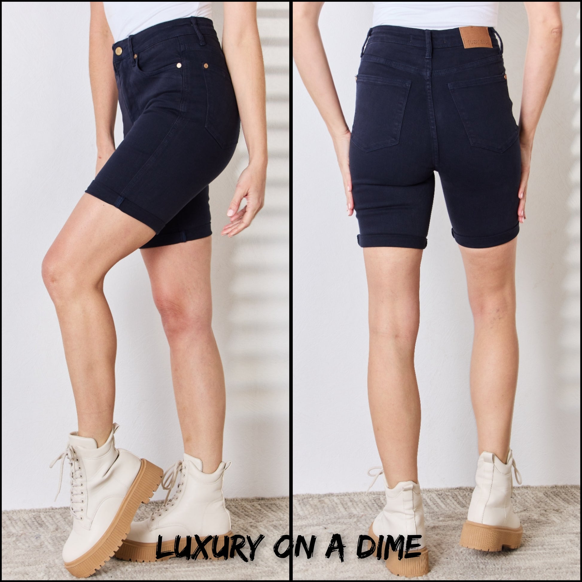 High Rise Tummy Control Cuff Hem Bermuda Denim Navy Jean Shorts Judy Blue
