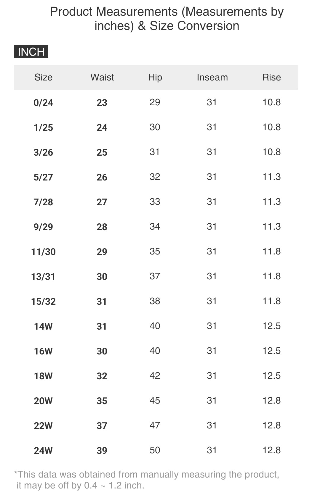 | Size | Waist | Hip | Inseam | Rise |