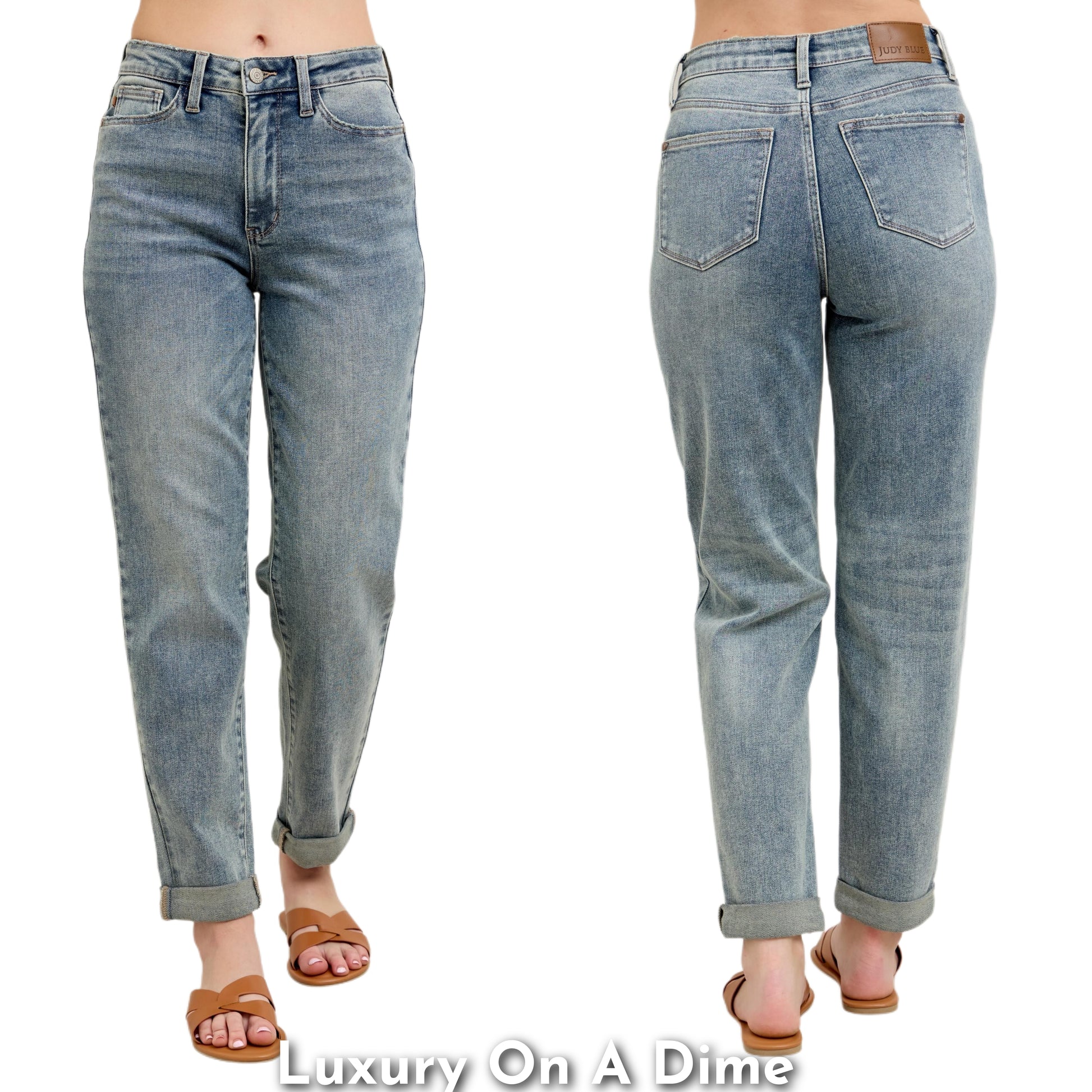 Judy Blue High-Rise Waist Boyfriend Jeans Cuffed Straight Leg Relaxed Denim Pants Plus Size Available