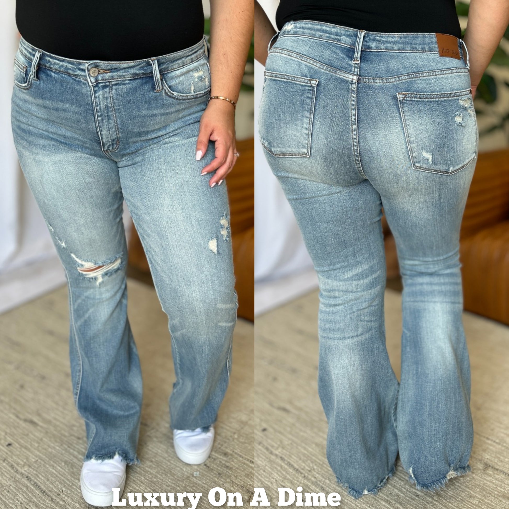 Judy Blue Mid-Rise Tummy Control Jeans Flare Hem Retro Distressed Denim Pants