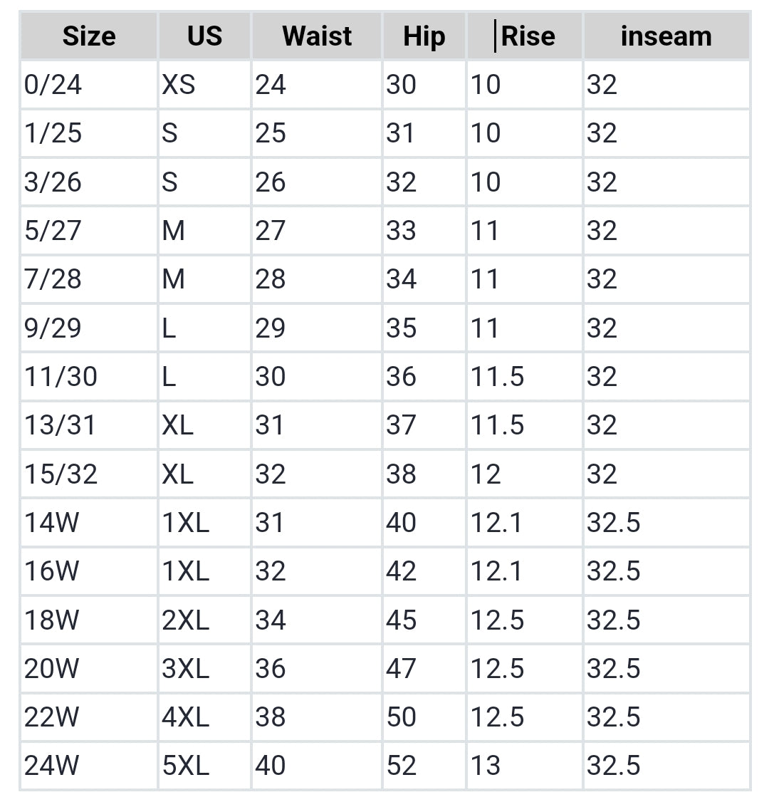 | Size | US | Waist | Hip | Mid Rise | inseam |