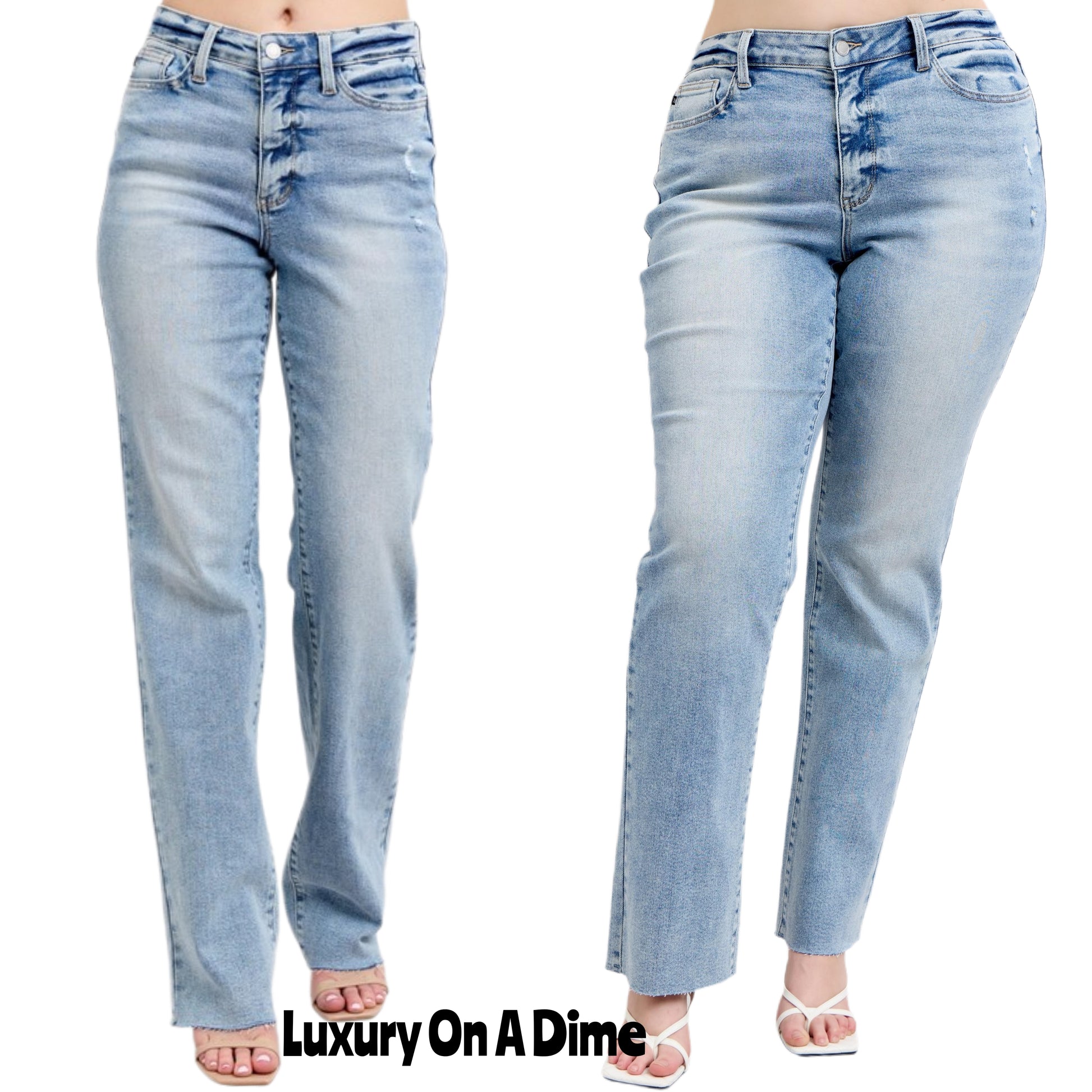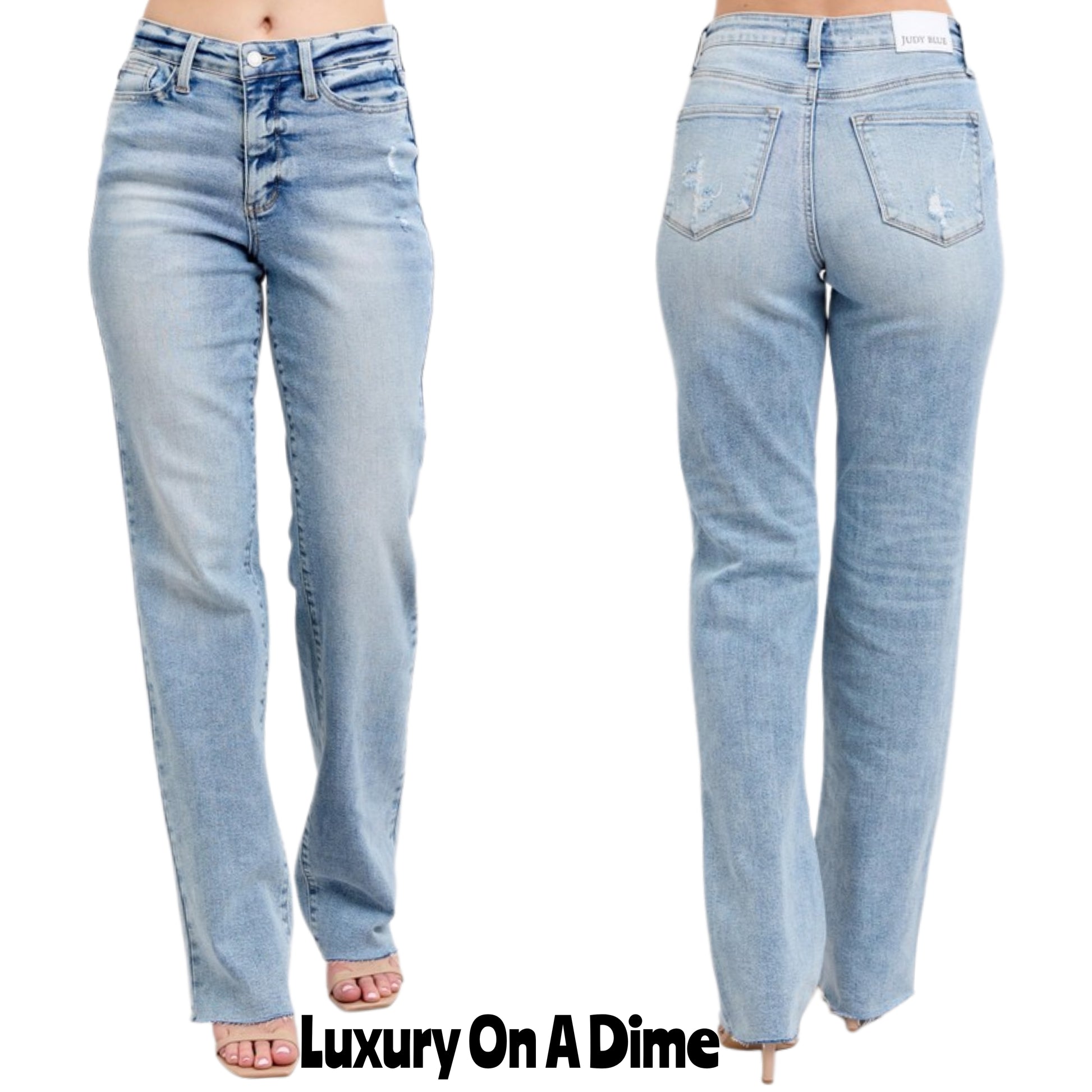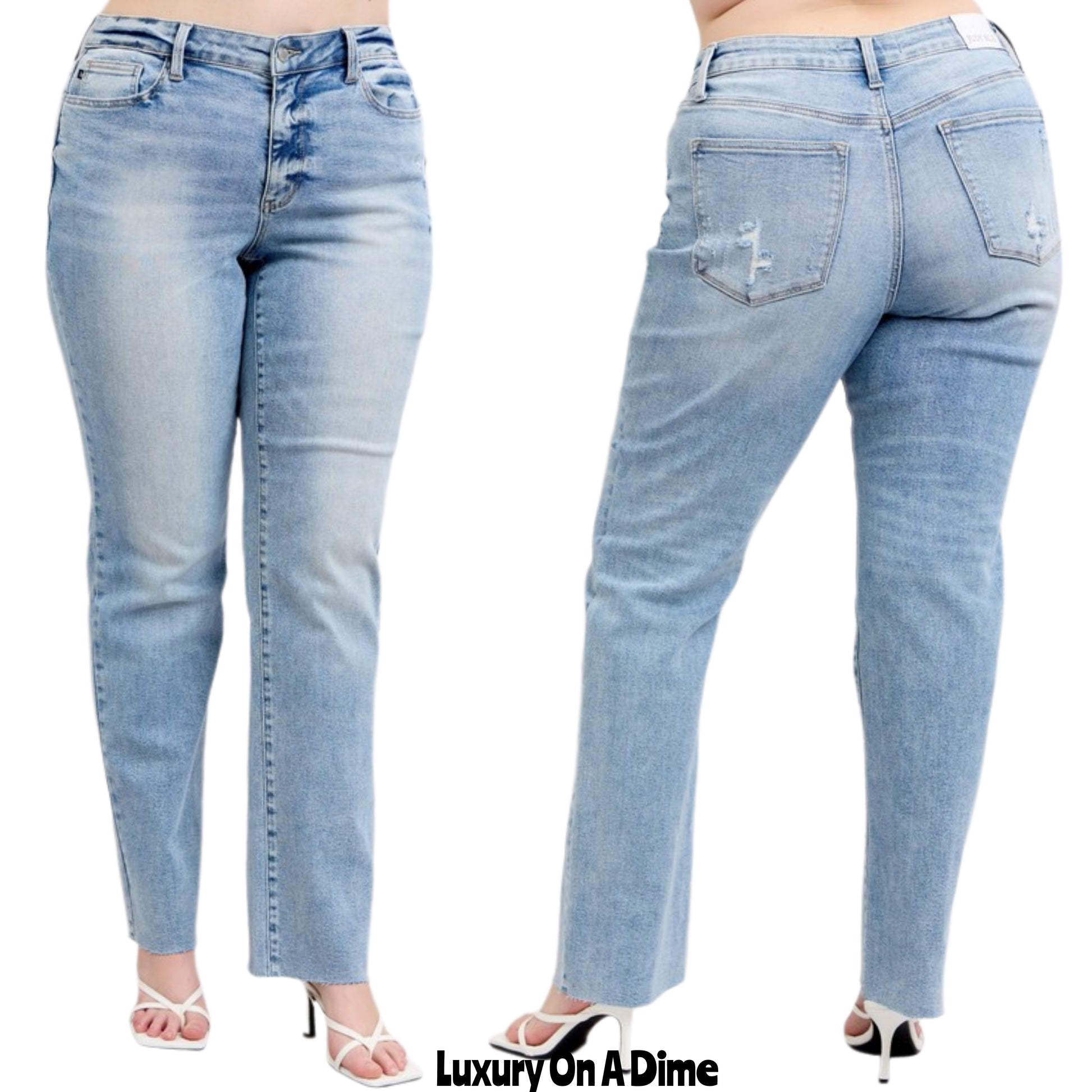 Judy Blue Mid-Rise Relax Dad Straight Leg Distressed Jeans Raw Hem Denim Pants