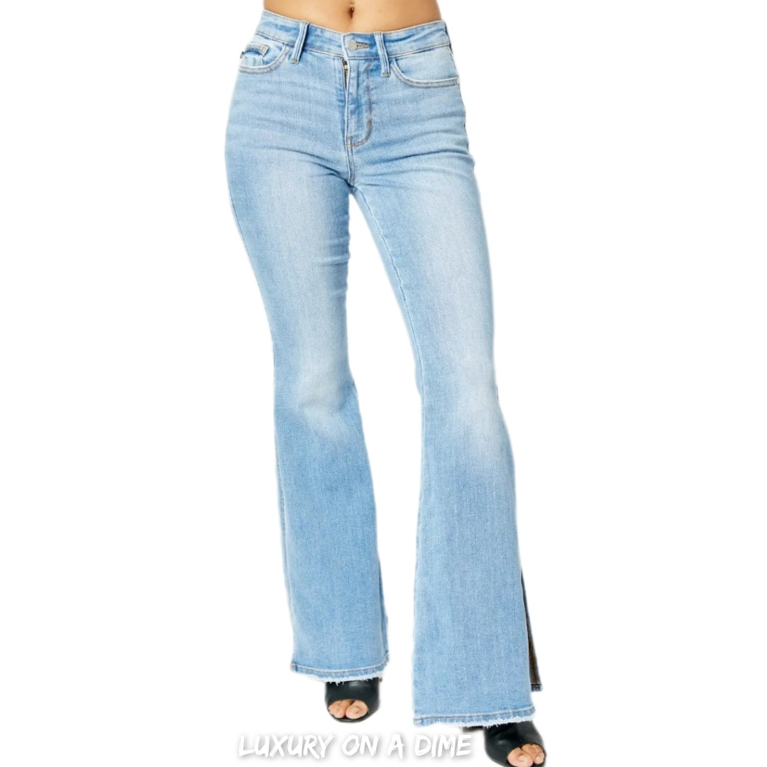Retro Mid-rise Split Bell Bottom Flare Leg Raw Hem Skinny Judy Blue Jean Pants