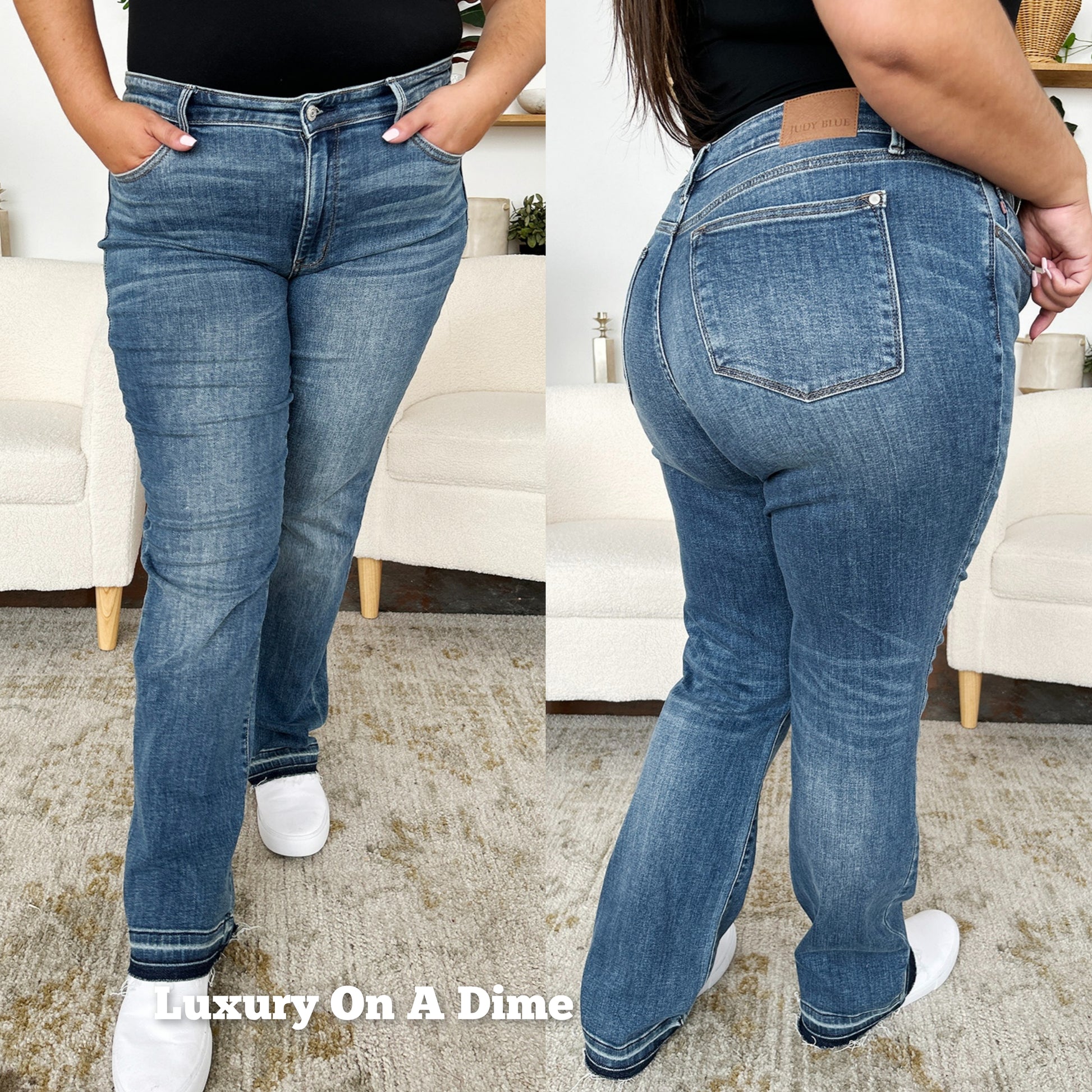 Judy Blue Mid-Rise Straight Leg Boyfriend Jeans Released Raw Hem Denim Pants