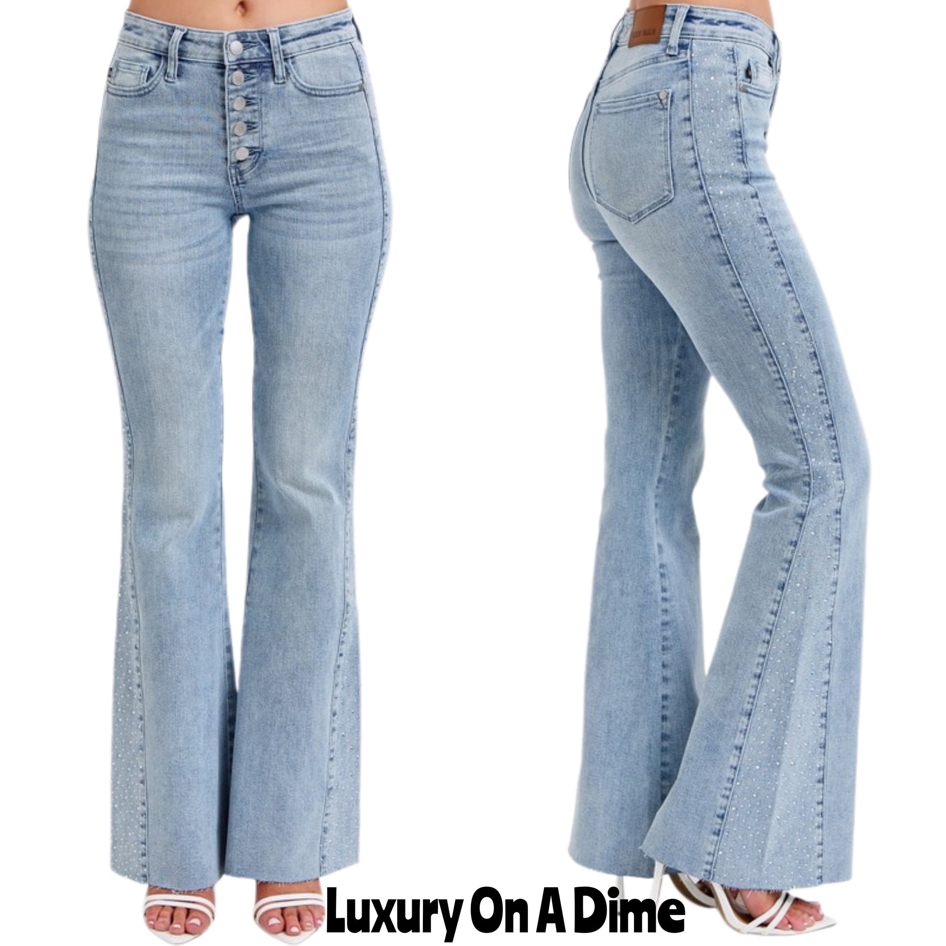 Judy Blue Rhinestone Flare Mid-Rise Button Closure Slim Fit Pants Denim Jeans