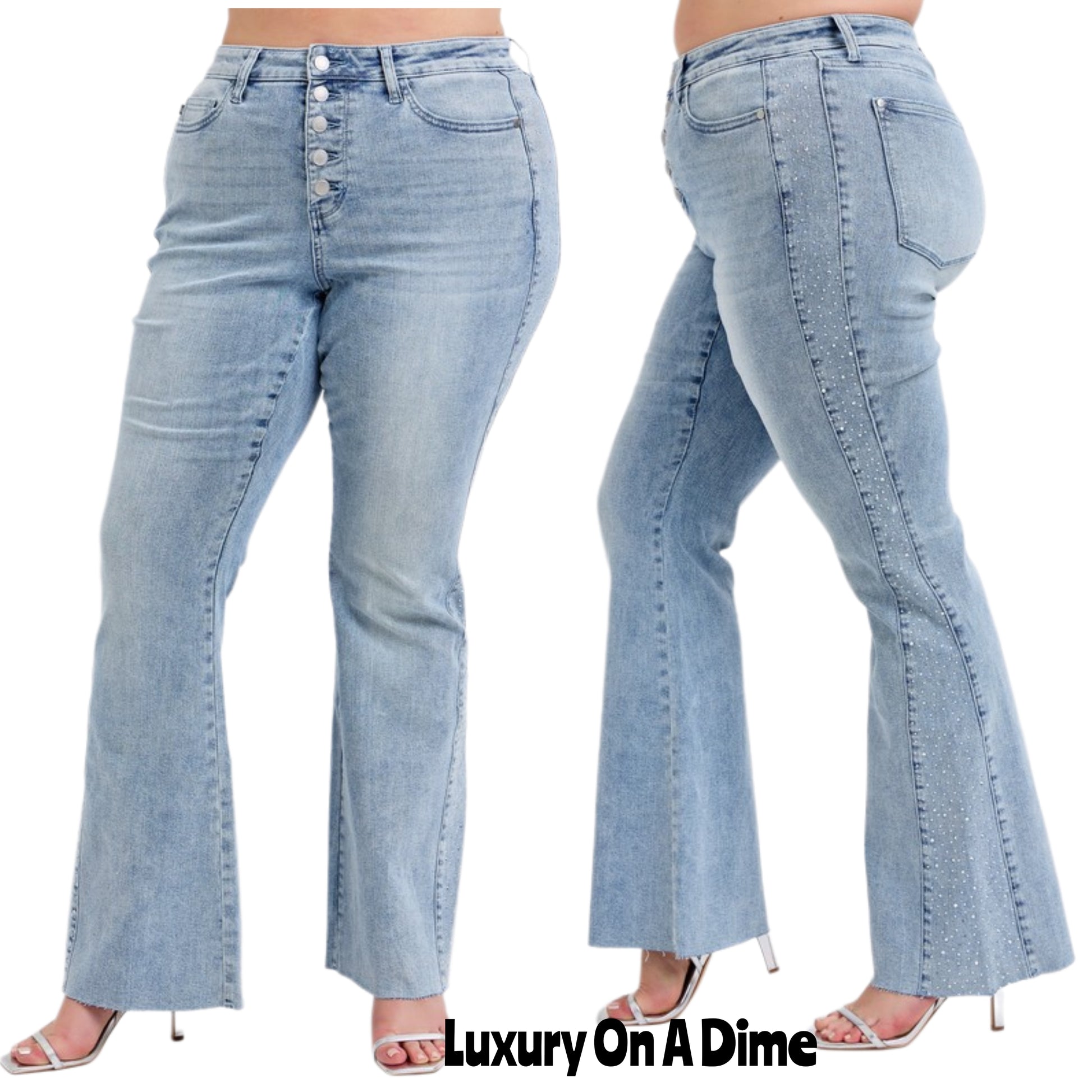 Judy Blue Full Size Mid Rise Rhinestone Side Panel Detail Flare Jeans Plus Size