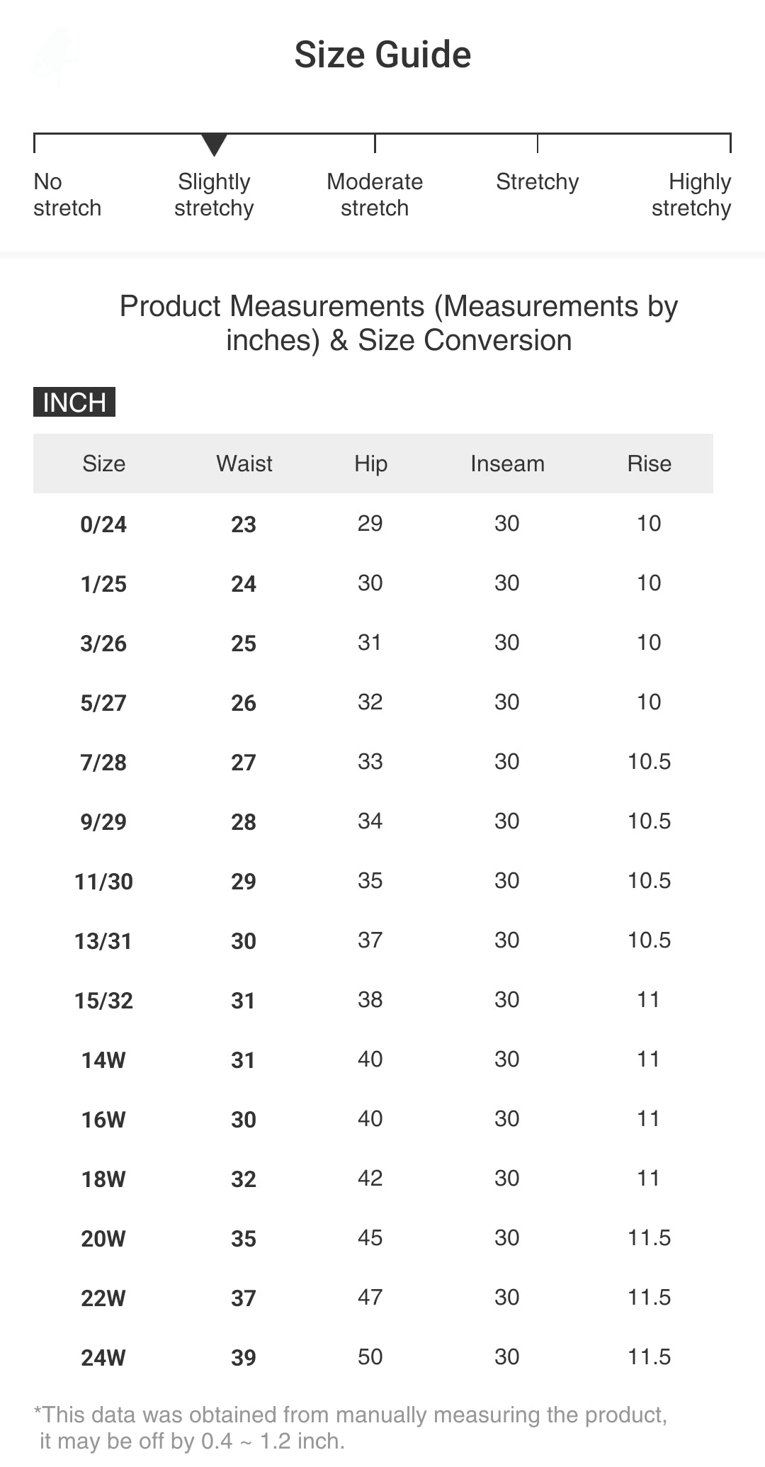 | Size | Waist | Hip | Inseam | Rise |