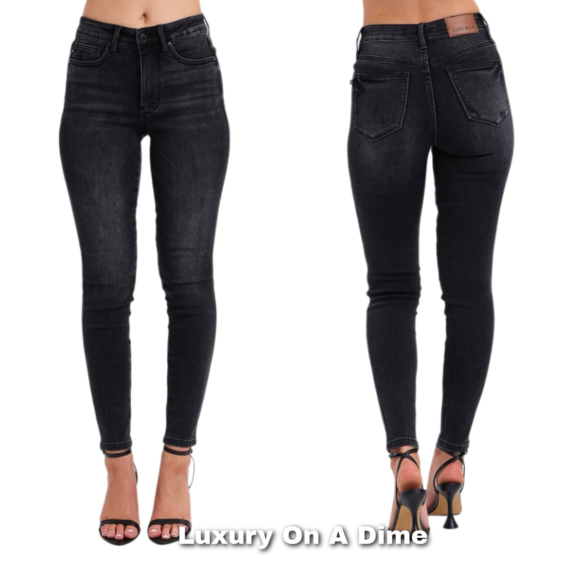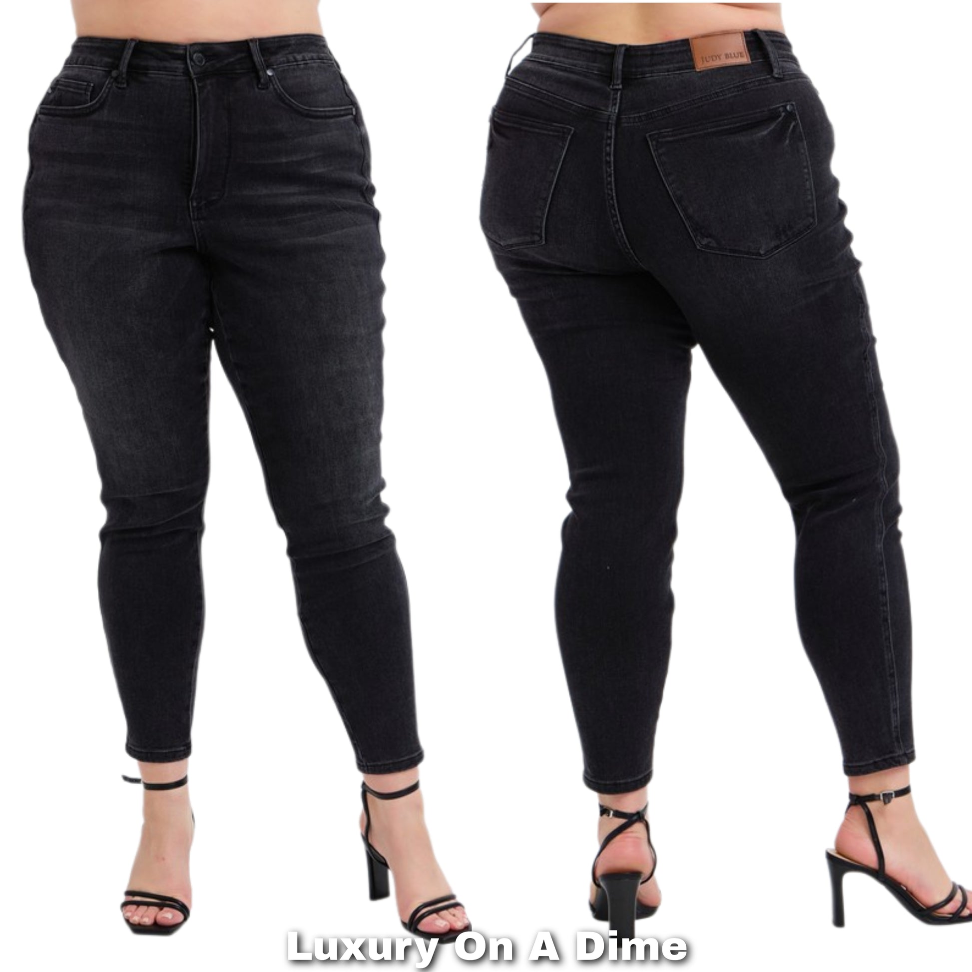 Judy Blue Tummy Control Mid-Rise Slim Fit Black Denim Skinny Jeans Ankle Pants Plus Size Available