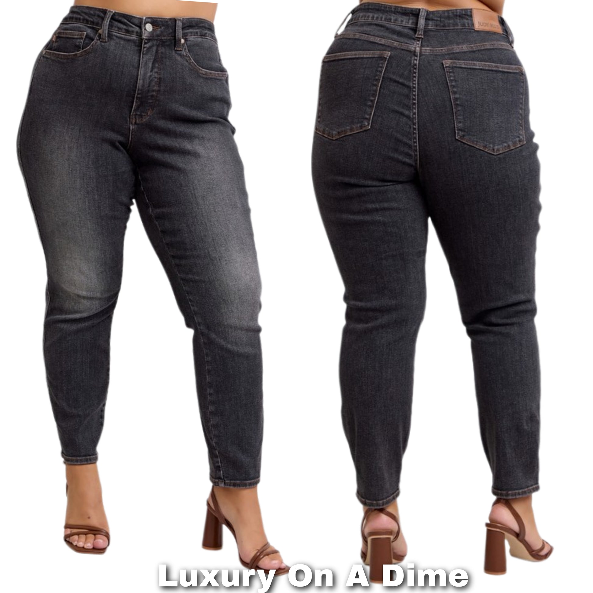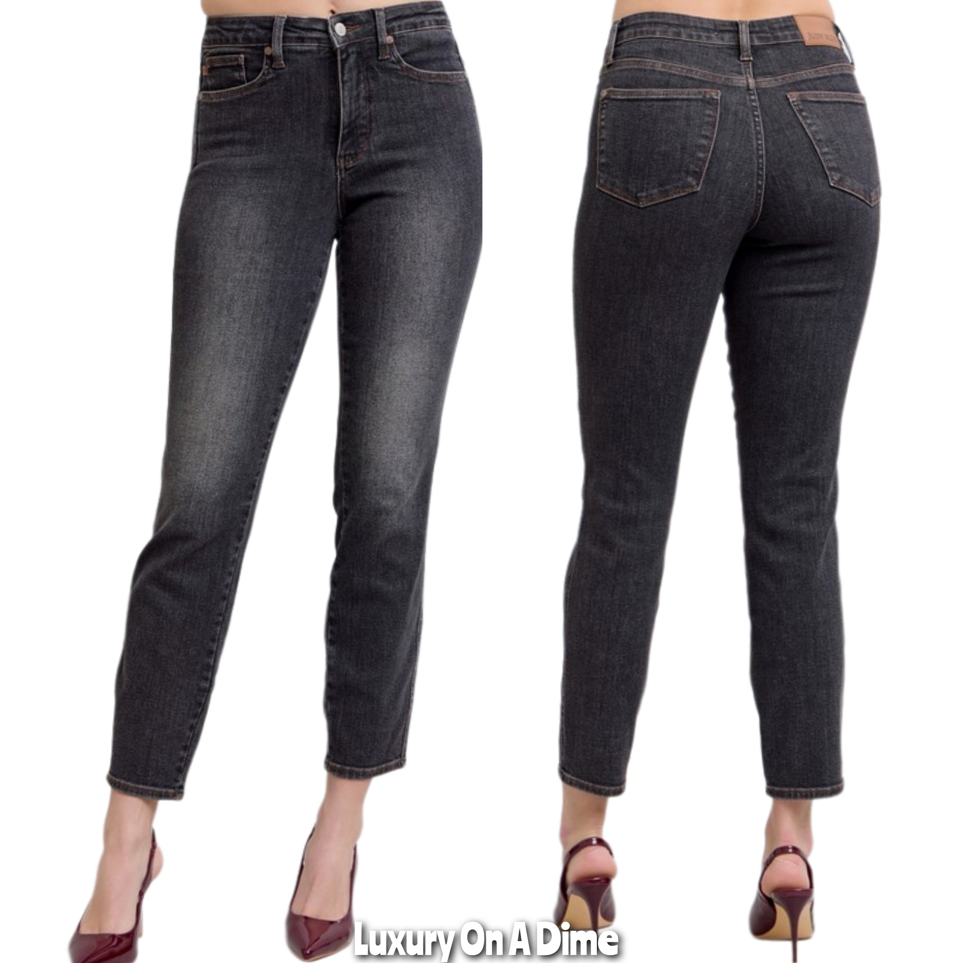 Judy Blue Tummy Control Mid-Rise Slim Fit Black Denim Skinny Jeans Ankle Pants Plus Size Available