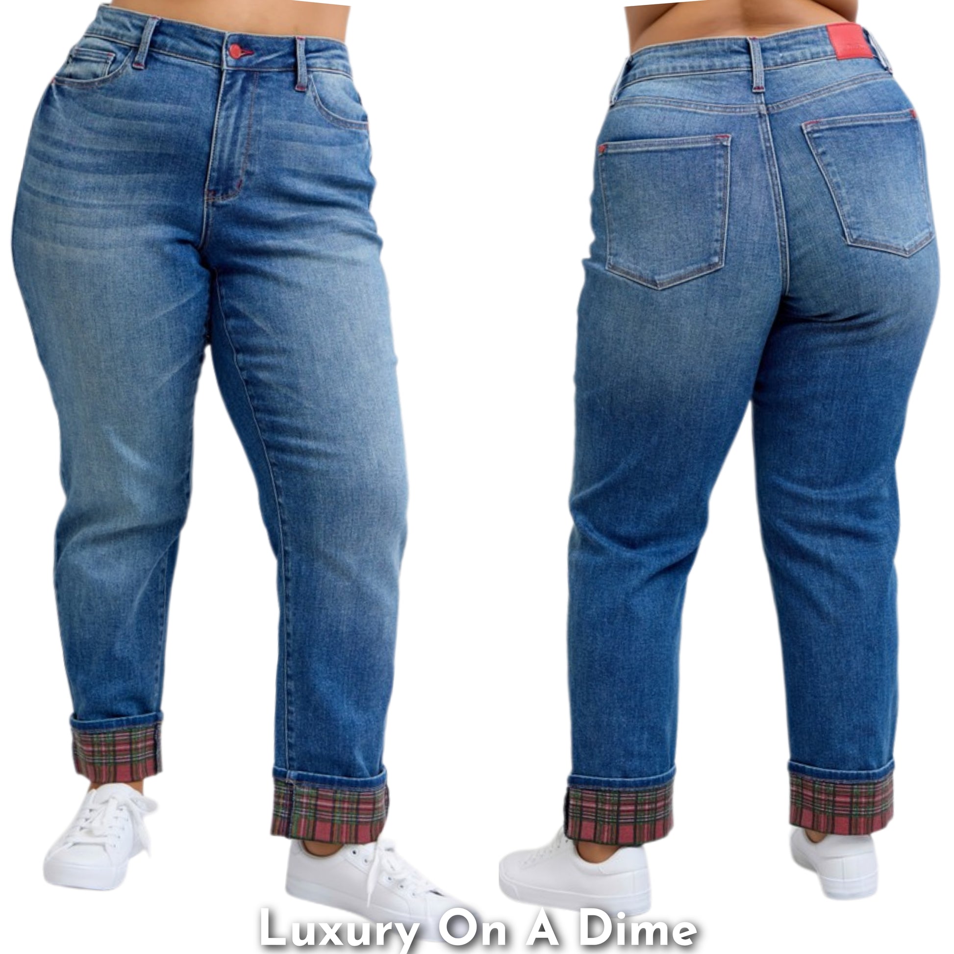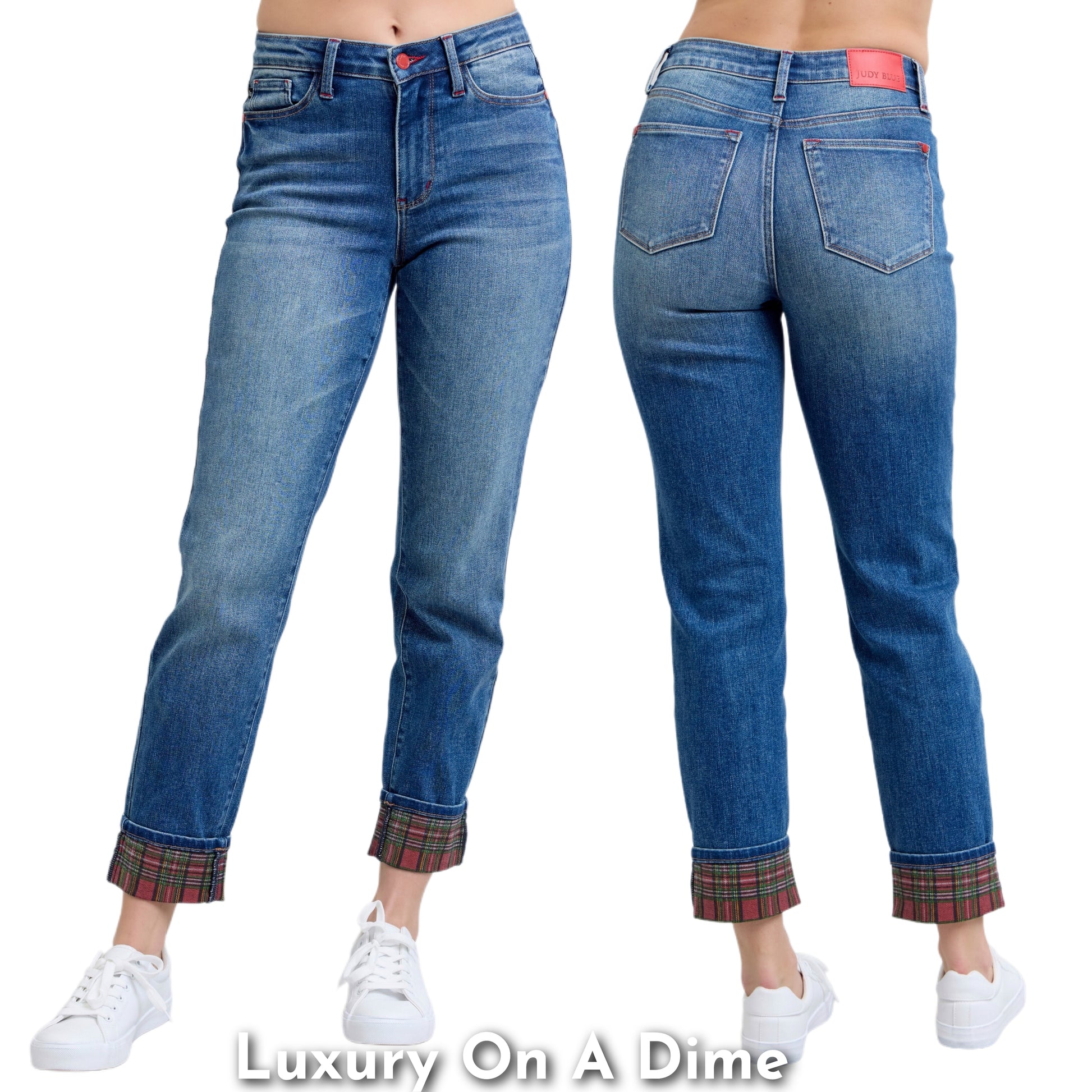 Judy Blue Red Plaid Cuffed Mid-Rise Skinny Denim Boyfriend Jeans Ankle Pants Plus Size Available