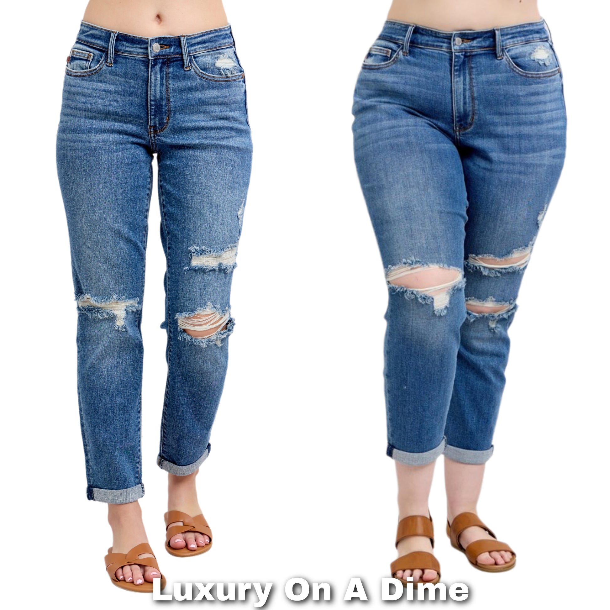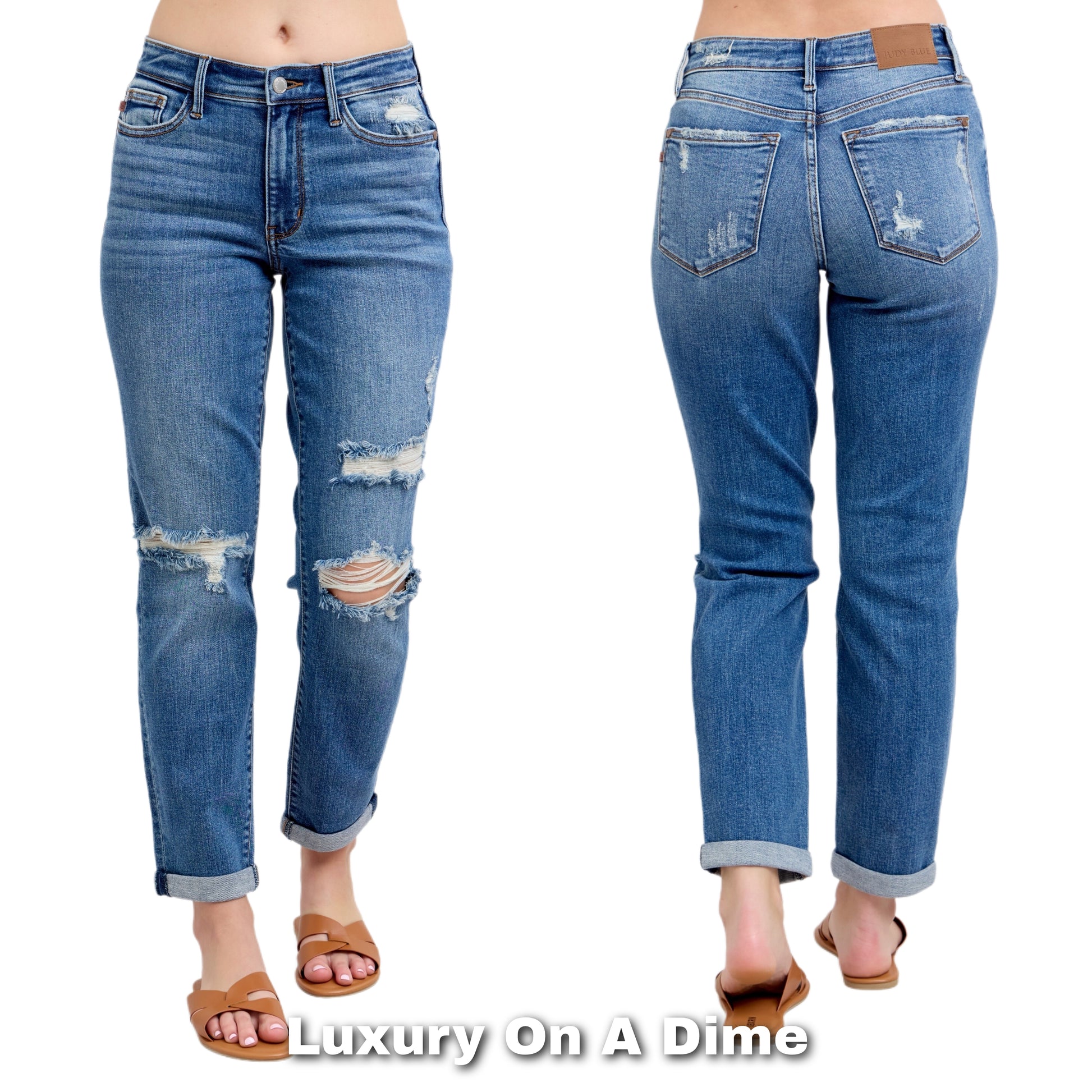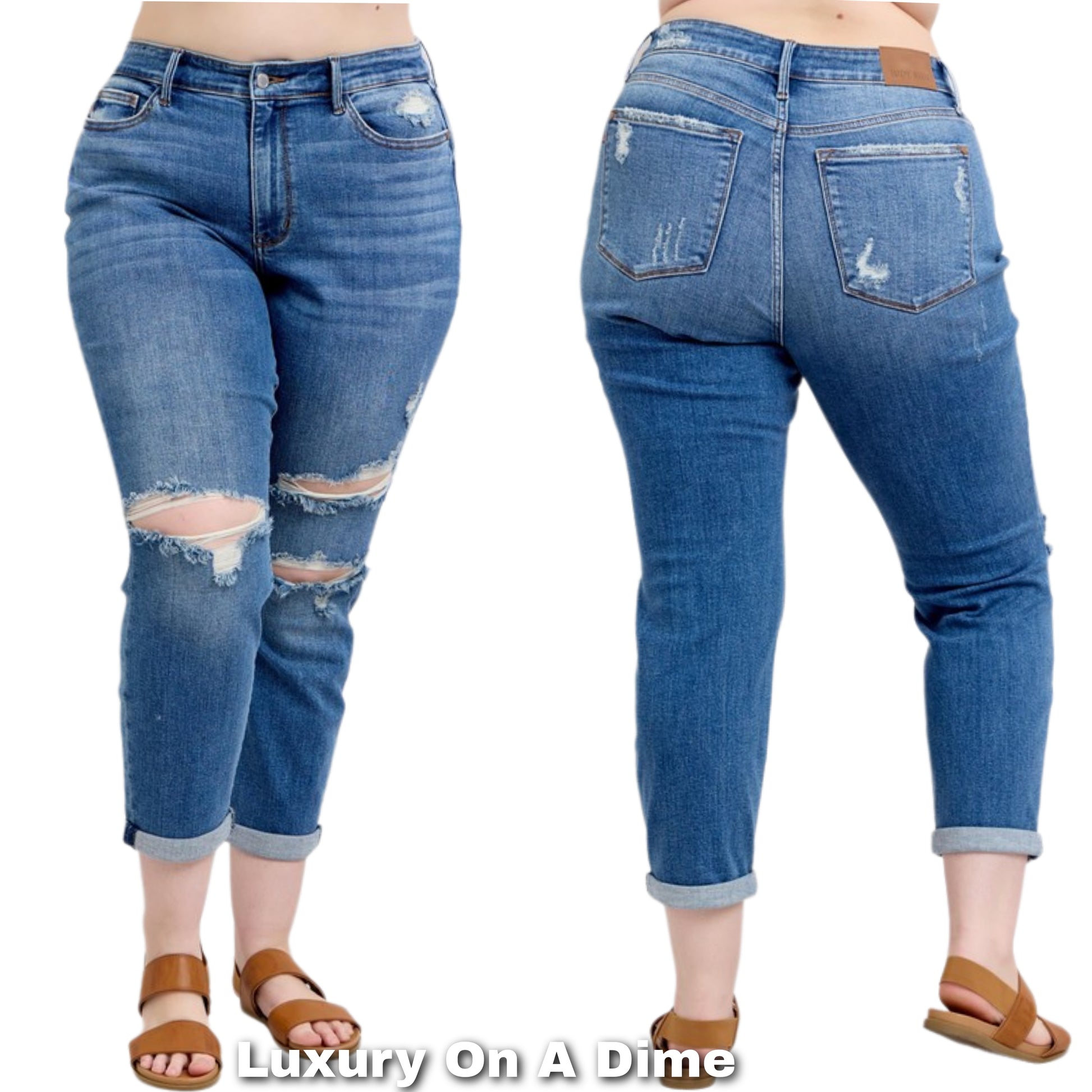 Judy Blue Mid-Rise Boyfriend Distressed Jeans Straight Leg Cuffed Denim Pants Plus Size Available