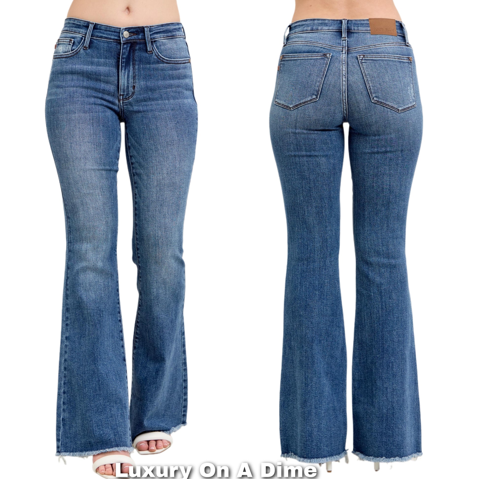 Judy Blue Mid-Rise Slim Fit Flare Leg Raw Cut Distressed Hem Pants Denim Jeans Plus Size Available