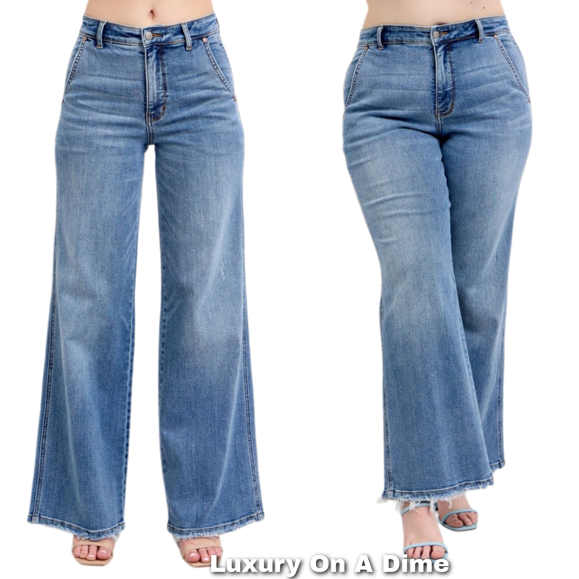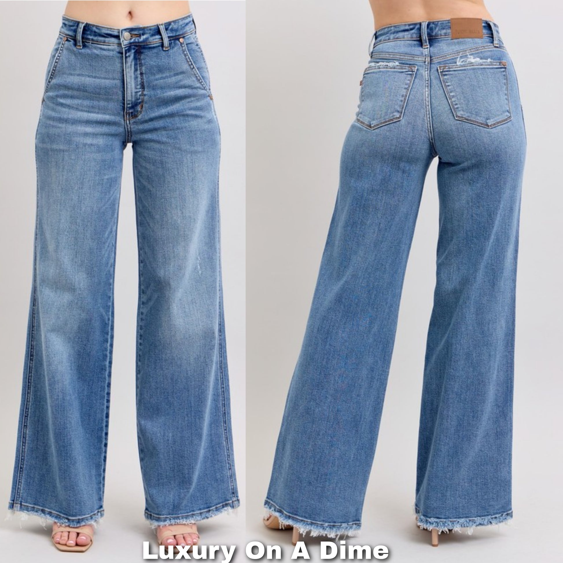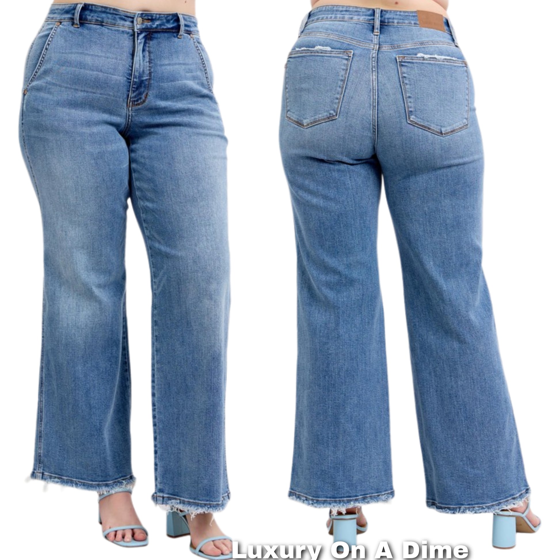 Judy Blue High-Rise Pants Wide Leg Relaxed Fit Distressed Raw Hem Jeans Denim Plus Size Available