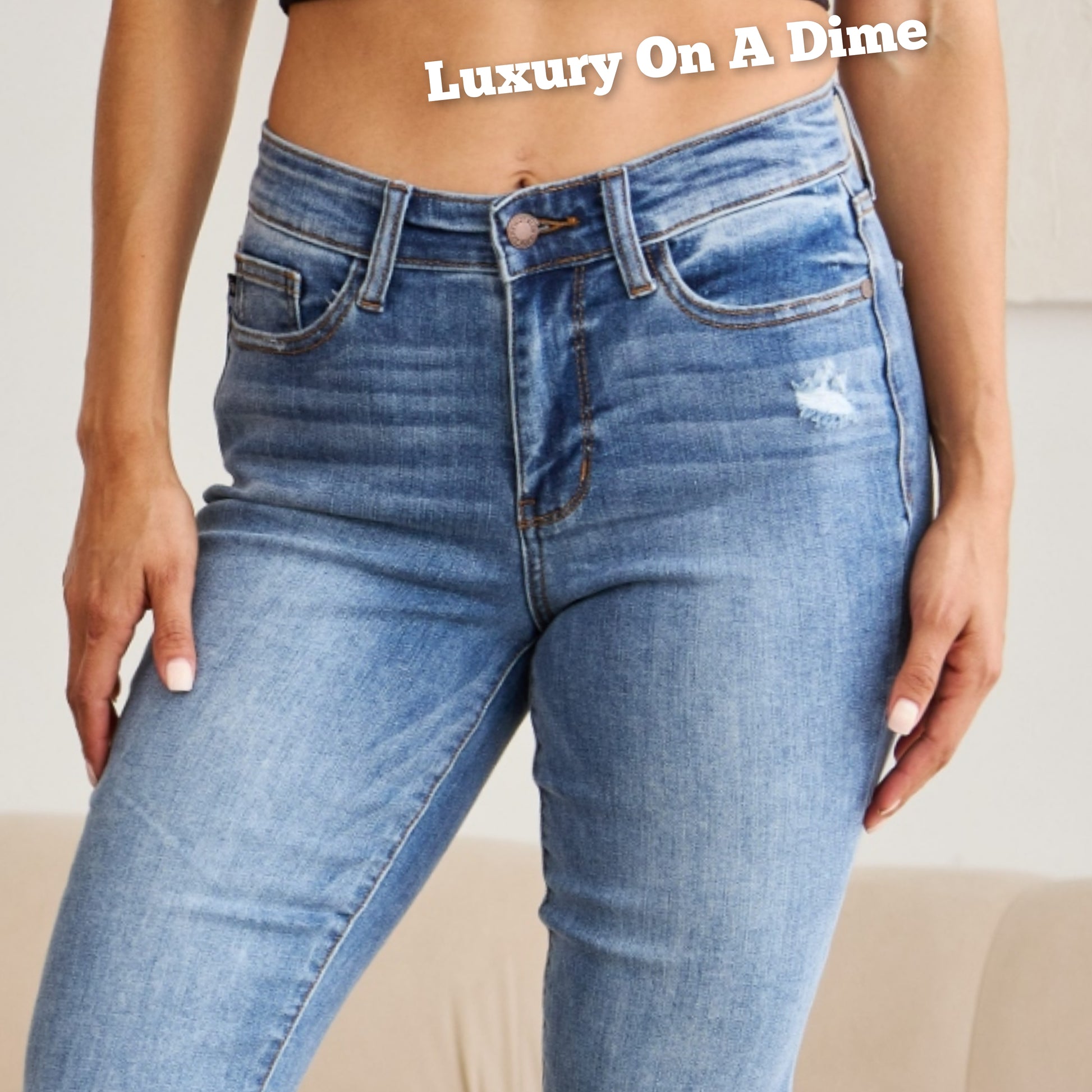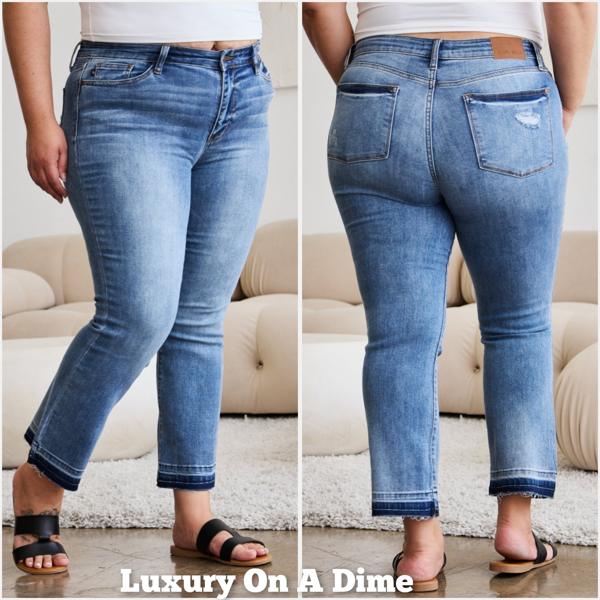 Judy Blue Mid-Rise Raw Distressed Wide Bootcut Cropped Hem Denim Jean Pants