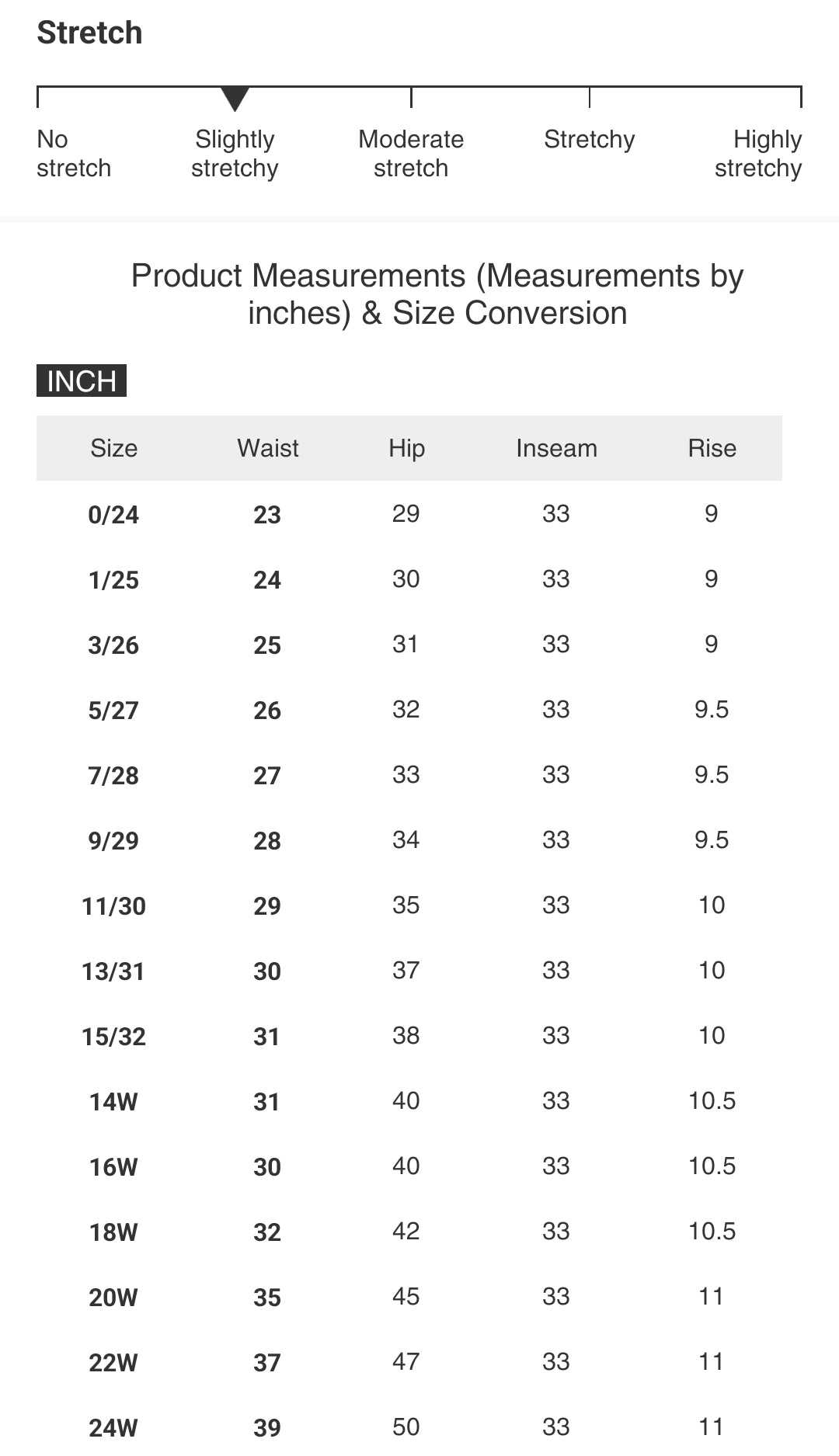 | Size | Waist | Hip | Inseam | Rise |