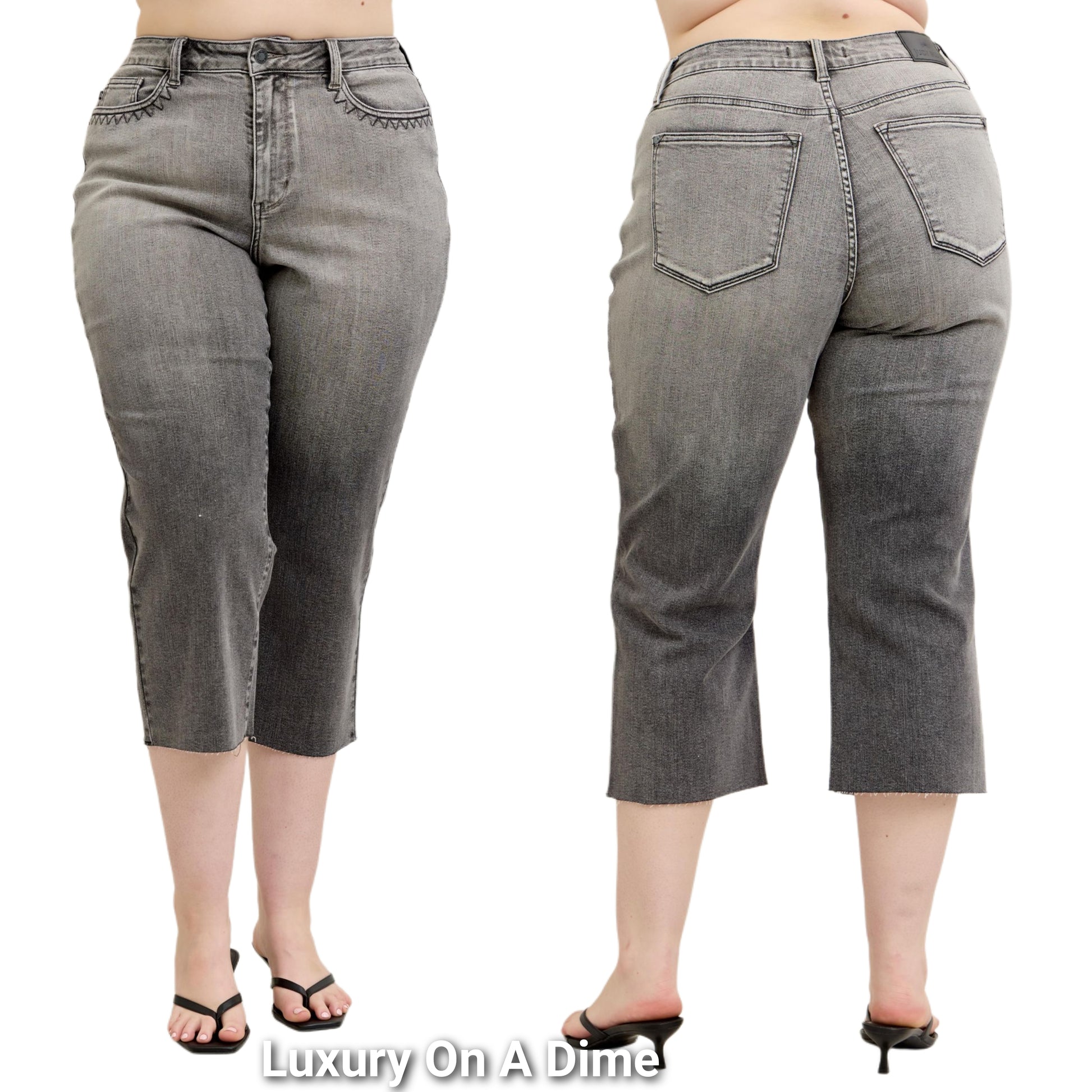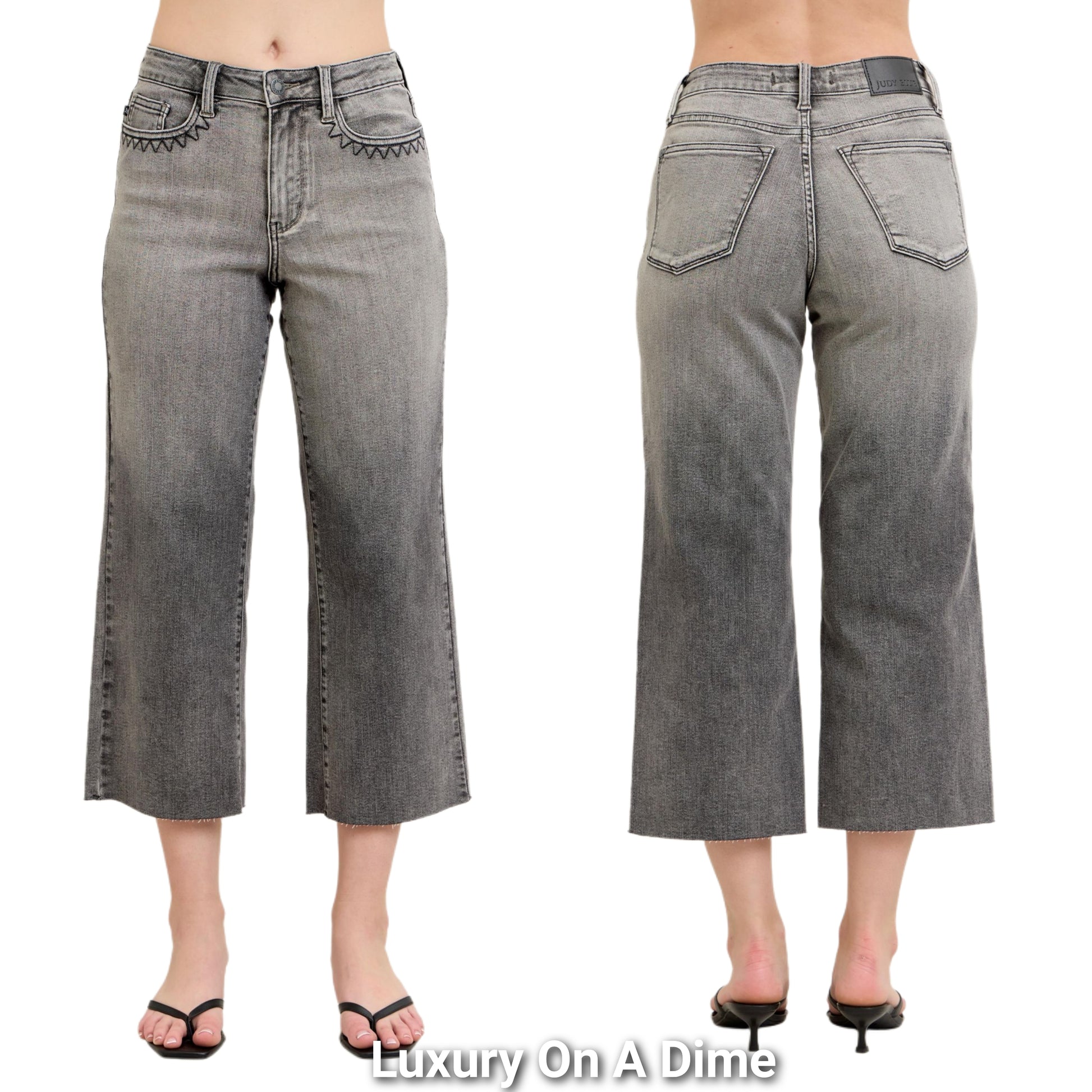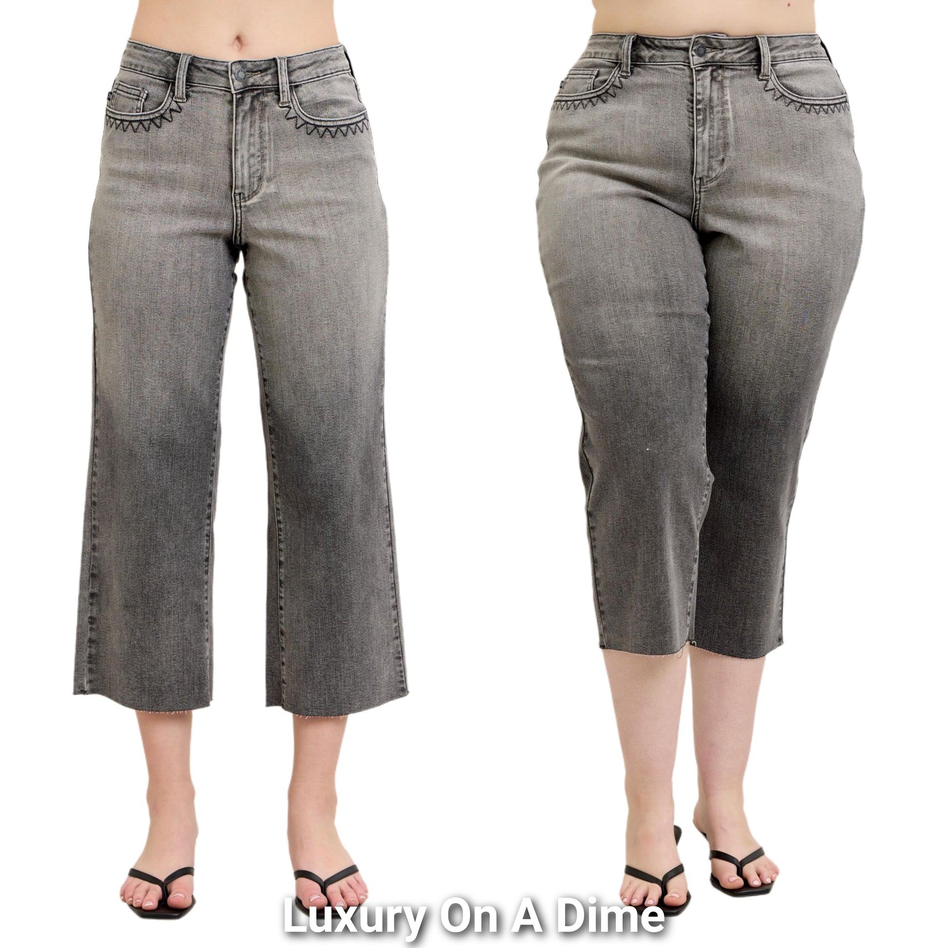 Judy Blue High-Rise Embroidered Hip Wide Leg Capri Pants Relaxed Fit Denim Jeans Plus Size Available