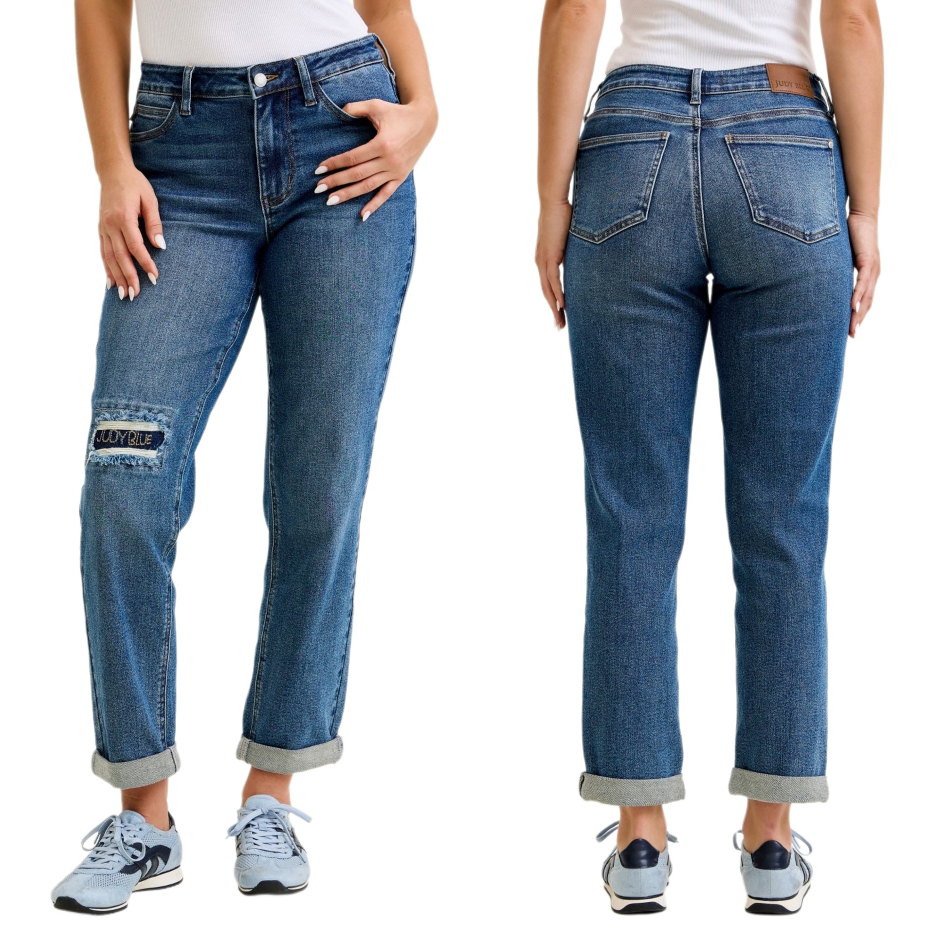Judy Blue Mid-Rise Boyfriend Embroidered Distressed Repair Patch Jeans Denim Pants