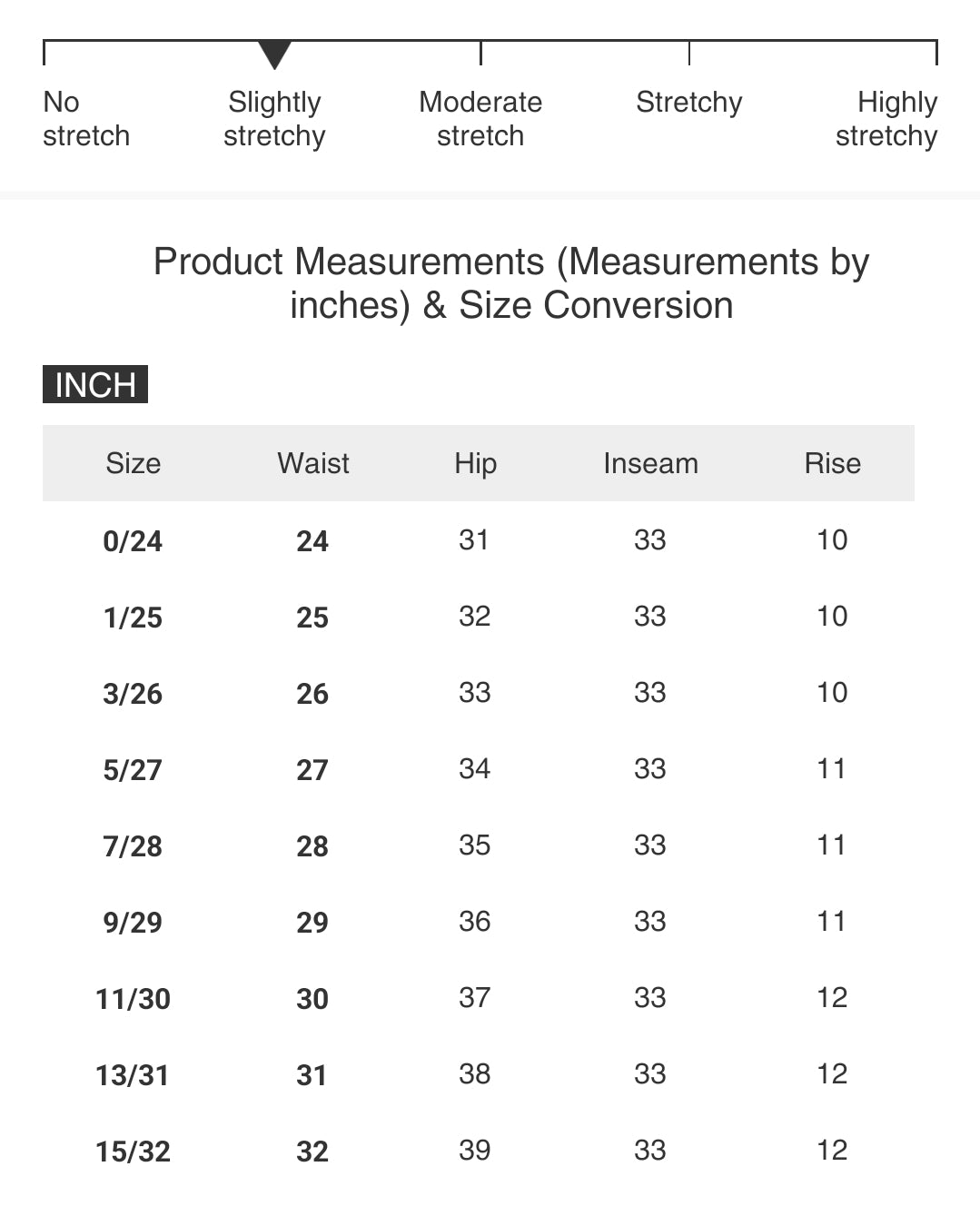 | Size | Waist | Hip | Inseam | Rise |