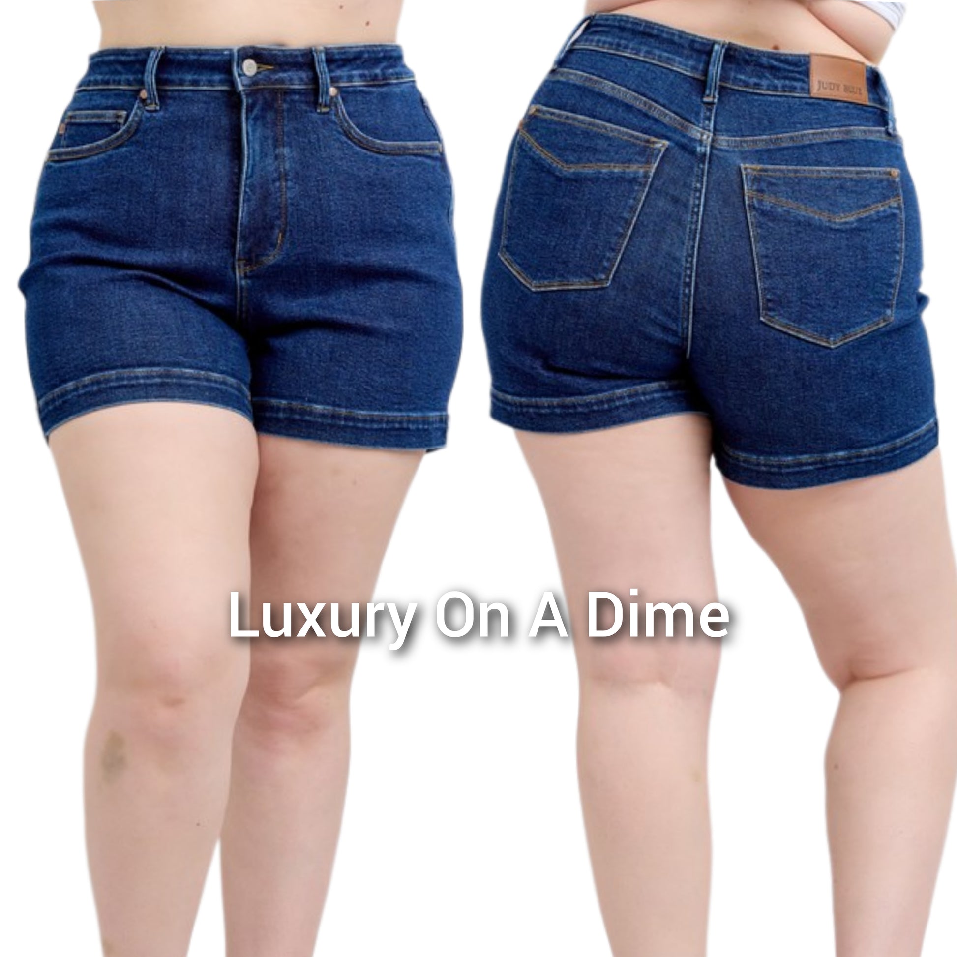 Judy Blue Tummy Control High-Rise Relaxed Boyfriend Fit Dark Blue Jean Denim Shorts