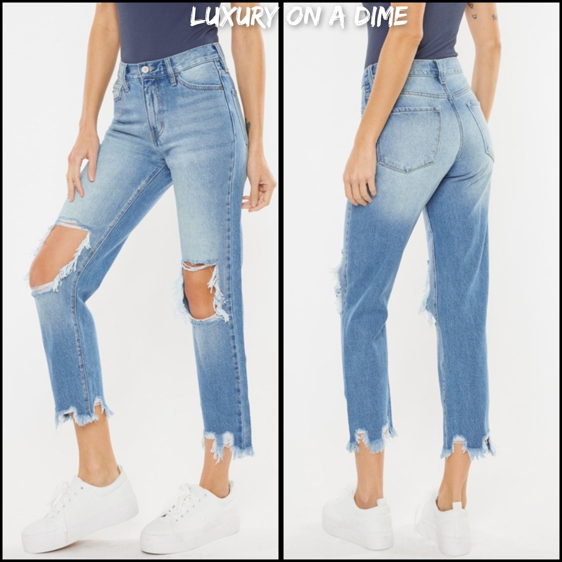KanCan High-Rise Distressed Denim Raw Cropped Straight Leg Mom Jean Cotton Pants